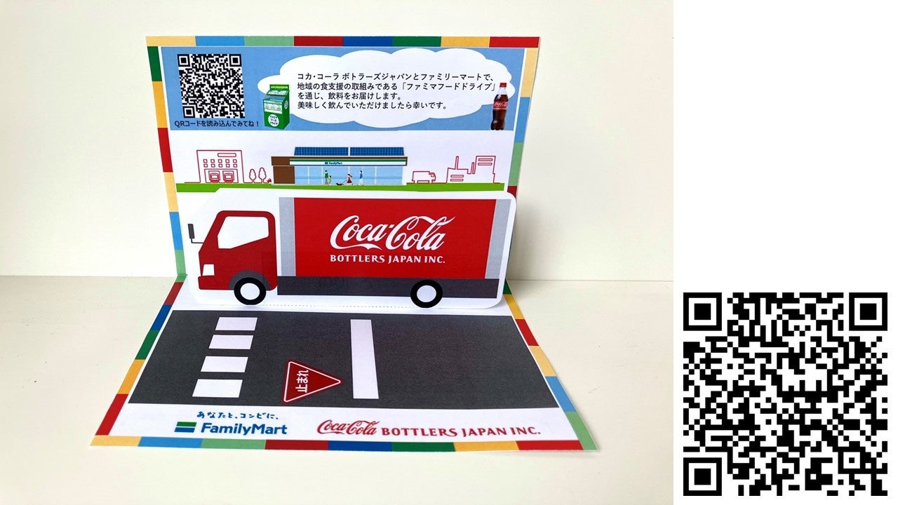 本取り組みは、ファミリーマートとコカ・コーラ ボトラーズジャパンが2023年2月から推進している、SDGs(持続可能な開発目標)の分野における連携・協力事業の一環として、昨年に続いて実施するものです。今年は、寄贈先を昨年の10か所から12か所に拡大し、毎月1か所に寄贈を行います。また、飲料製品をお受け取りいただく方に思いを伝えるため、両社のメッセージ動画を視聴できる二次元バーコード付きのポップアップカードを同封します。