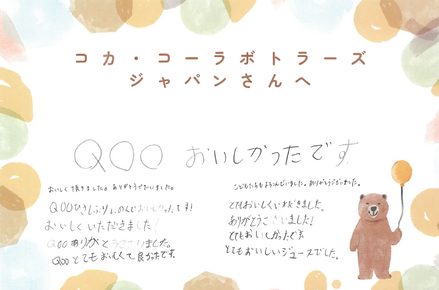 ・先日は、ご支援いただきありがとうございました。普段、PETボトルのジュースは買わないので、子供たちは大喜びで、飲み終わったあとのPETボトルとキャップも大事に取っていました。本当にありがとうございました。