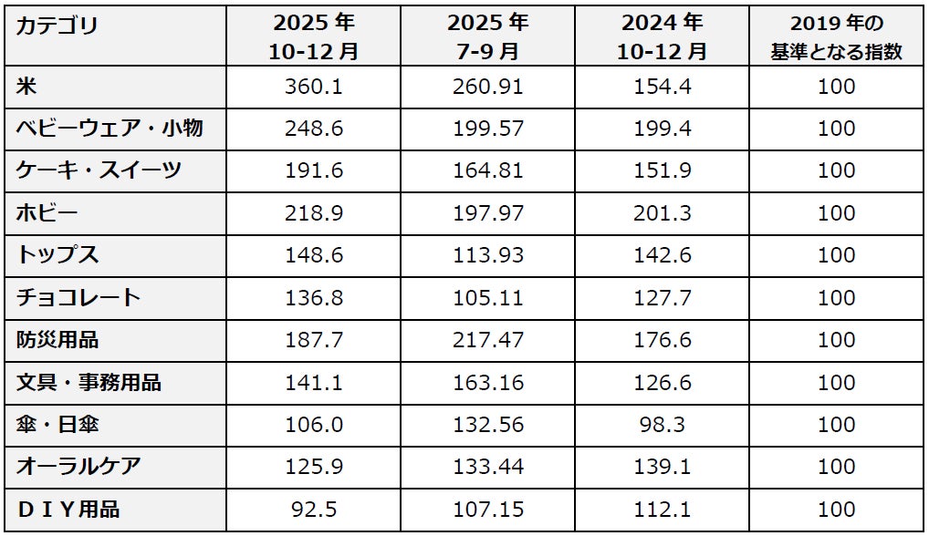 最大のトピックは、前期(7月~9月)に一度落ち着きを見せた「米」が再び急騰し、過去最高の360.12を記録したことです。また、年末のギフト・パーティー需要により、「ケーキ・スイーツ」「チョコレート」が大幅に上昇しました。