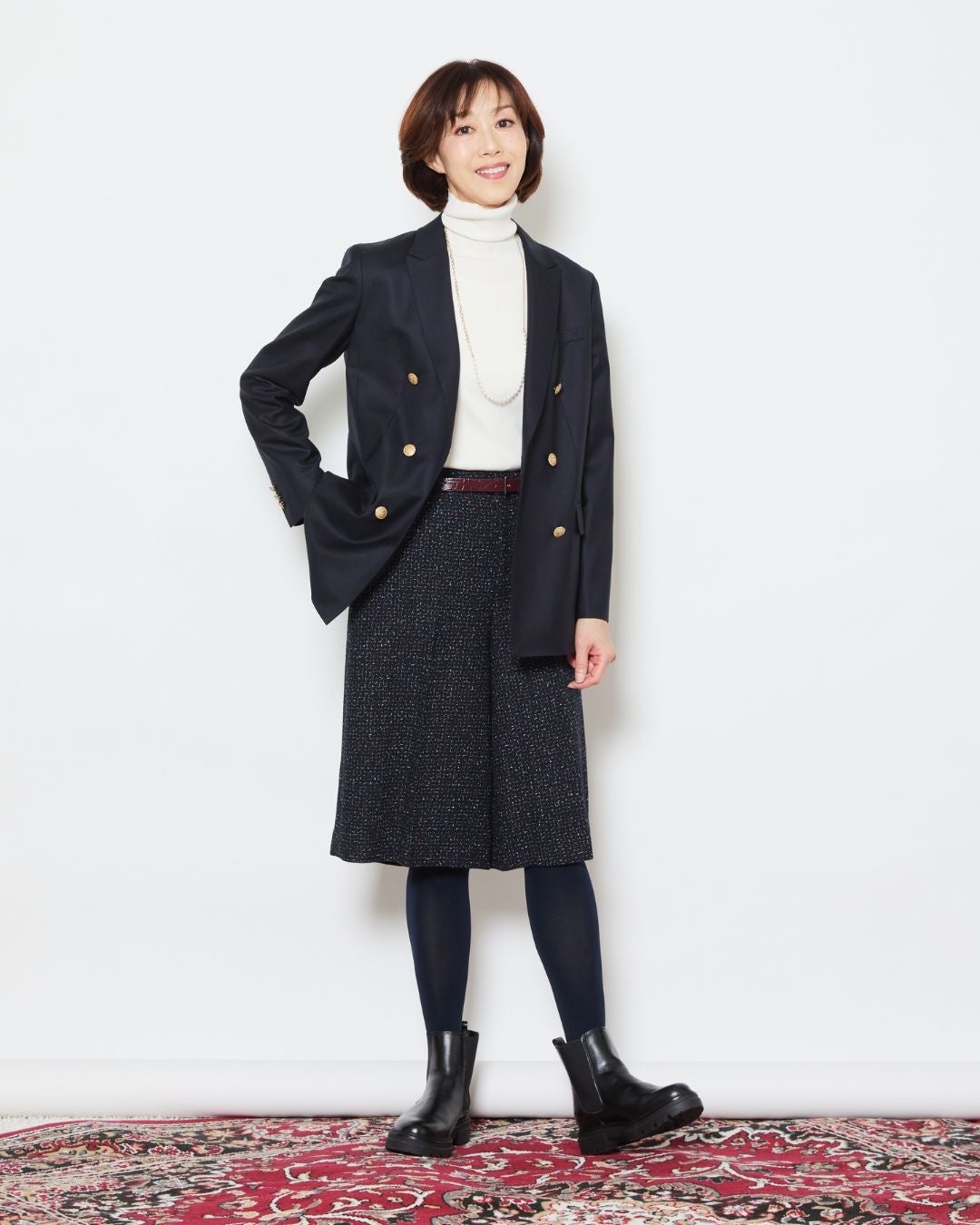 タートル×ツイードキュロットの上品な組み合わせ。端正なネイビーのダブルブレザーが、クラシックな着こなしをより知的に仕上げます。