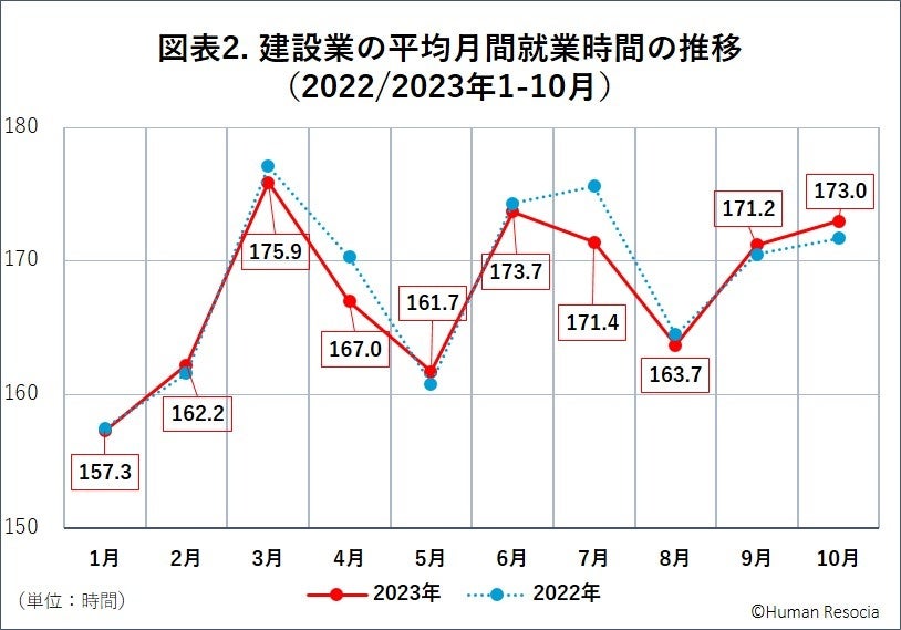 また、こうした長時間労働の実態は、2023年に入ってからも大きく変わっておらず、1月から10月までの月間就業時間は前年と大きな差異はみられません(図表2)。旺盛な建設需要などを背景に、建設業では、長時間労働の改善が思うように進んでいない状況であり、いかに従業員の就業時間を削減しつつ、労働力を確保していくかが大きな課題であると考えられます。