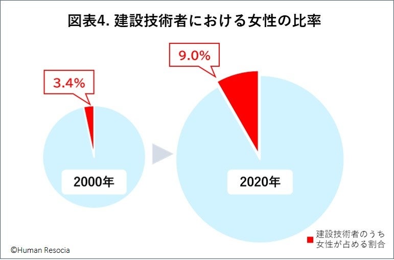 こうした状況を受け、建設各社は、女性や海外人材活用を進めています。建設技術者として就業している人のうち、女性の占める比率は、2000年の3.4%から、2020年は9.0%に上昇しました(図表4)。また、技術者を含む 「技術・人文知識・国際業務」の在留資格で建設業で就業いている海外出身者は、2017年から2022年にかけて3倍以上に増加しています。