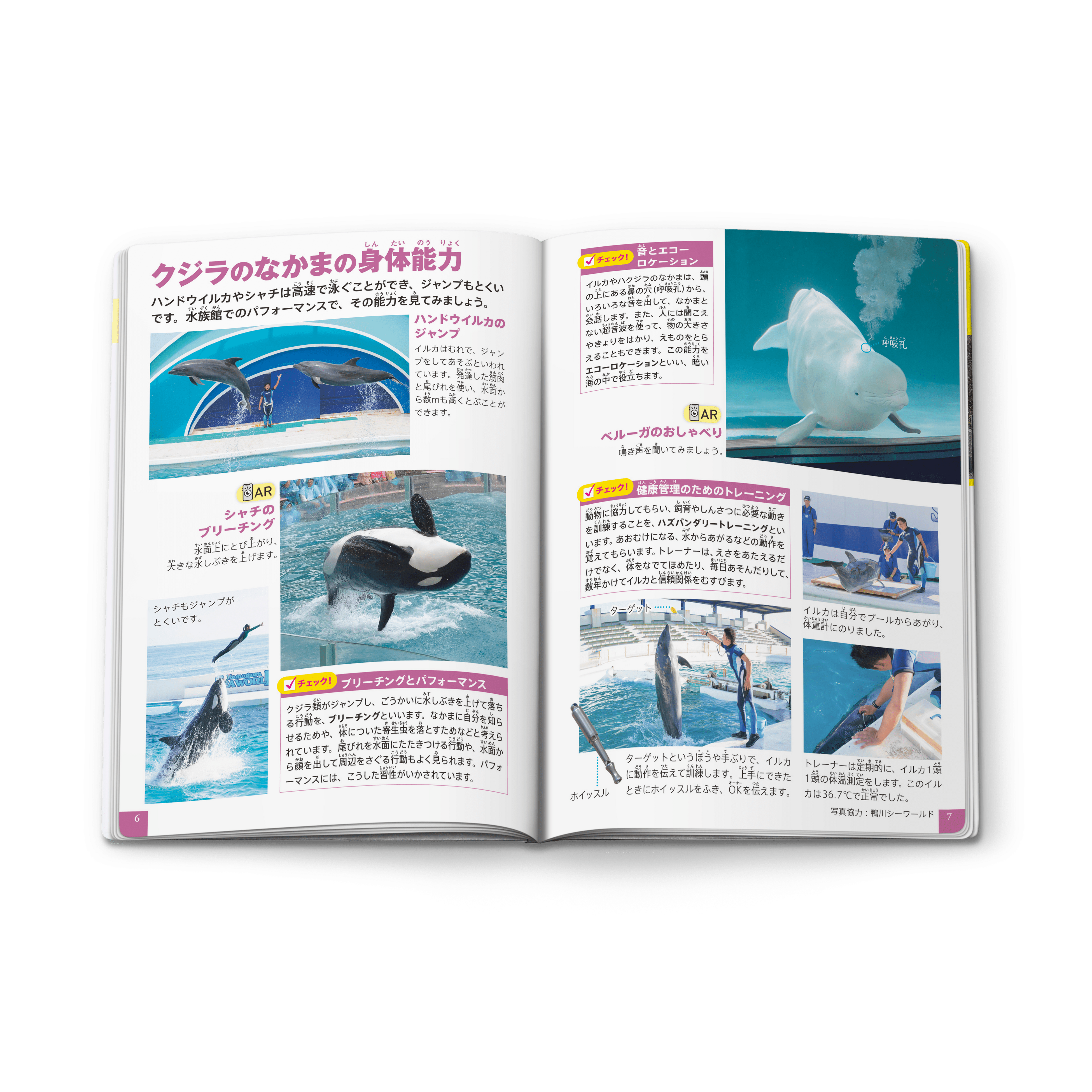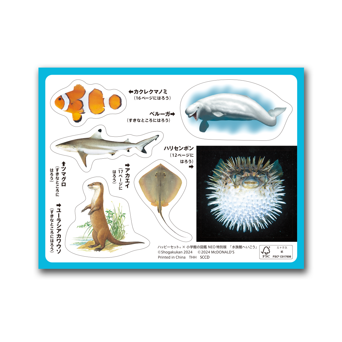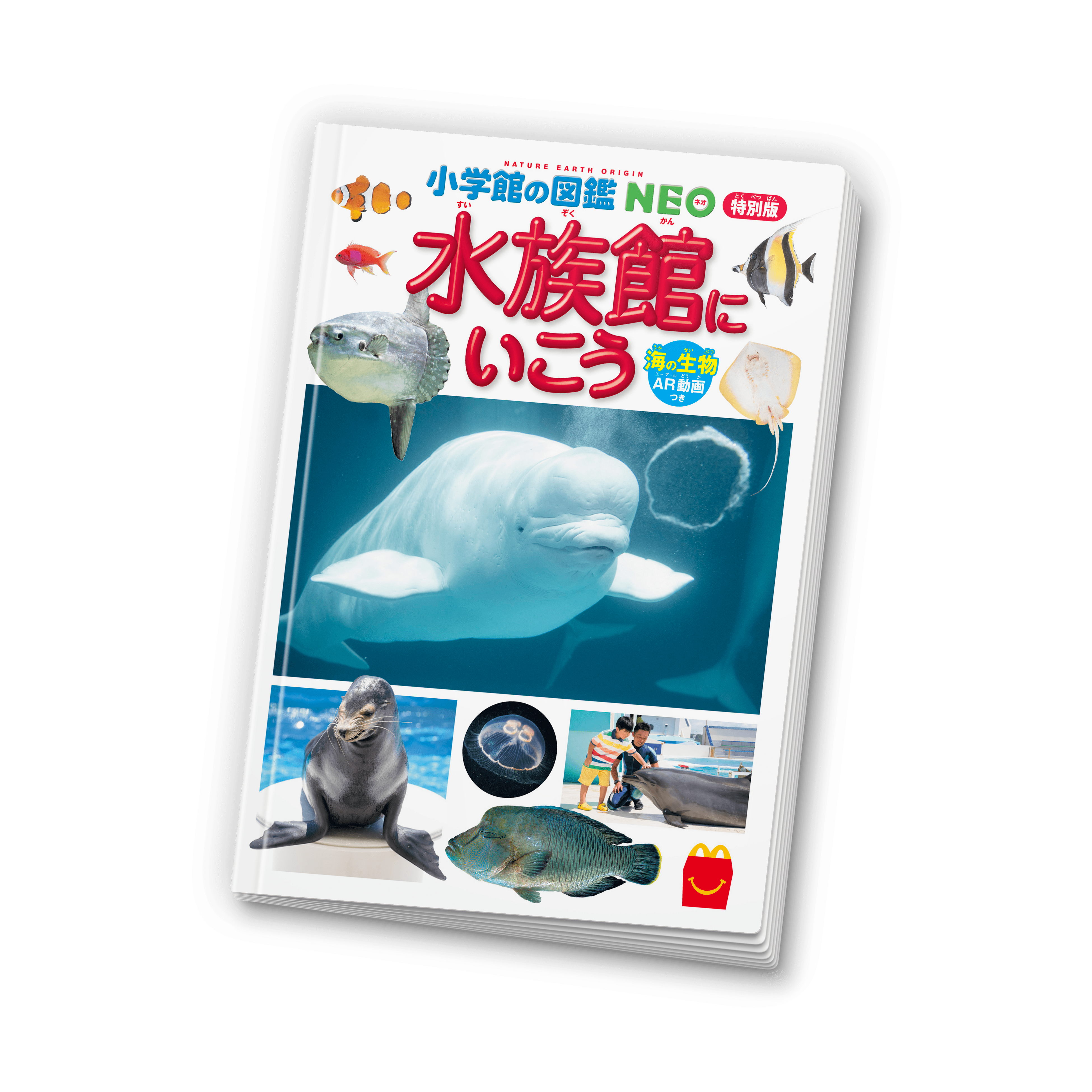 小学館の図鑑NEOシリーズから「魚」「動物」「水の生物」「鳥」をハッピーセット用に特別編集されたミニ図鑑「水族館にいこう 海の生物クイズつき」は、当館協力のもと、シャチやベルーガ、アシカなど、海の生物の写真を撮り下ろしました。また飼育員のお仕事についても知ることができ、普段は知ることのできない水族館についての情報が凝縮したミニ図鑑です。スマートフォンで図鑑のARマークを読み込むと、海の生物たちの動画や鳴き声を再生することができます。子どもたちの生物への興味を育む一端としてお役立てください。