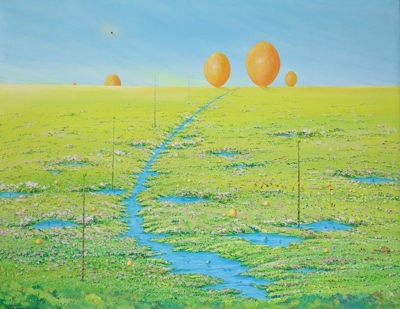 どこまでも青い空、光に満ちた草原には美しい水の流れ、爽やかな風が吹き抜け、遠くには命の象徴である卵 が世界の調和を保っている。草原を駆けていくこびとたちは、理想に向かって生きていく私たちを投影してい る。明るい色彩と精緻な表現により、愛に溢れた優しい世界が描かれており、天地人一体の哲学的な世界観を 作り上げている。