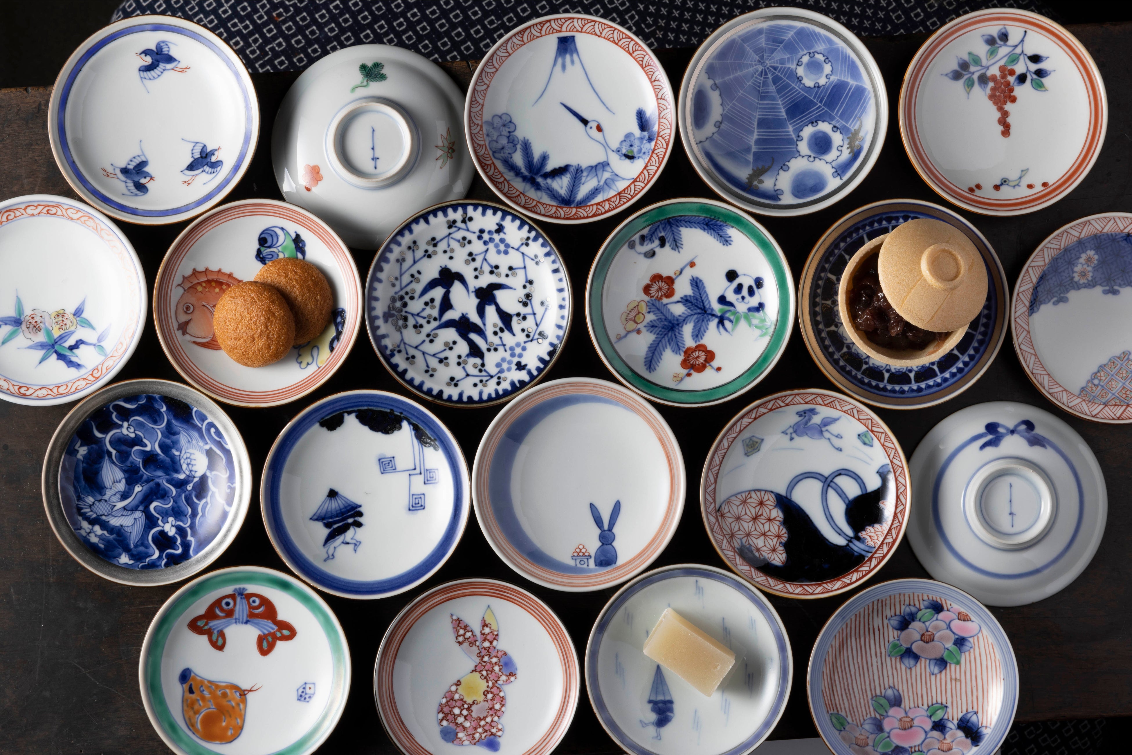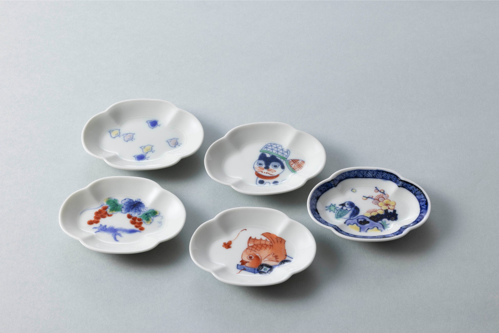 有田焼の伝統的な古典柄を受け継ぎつつ、赤絵や銀彩を加えて遊び心溢れる愛らしい絵付けをする。描くの は、古典的な文様から表情豊かなパンダ、笊かぶり犬など、自身がときめいたモチーフ。家庭画報 2022 年 9 月号の特集「今、欲しい『有田焼』」に掲載され、誌上販売では即完売した。 *手のひらに収まる木瓜形豆皿は、旅の思い出として一人に一つプレゼント。