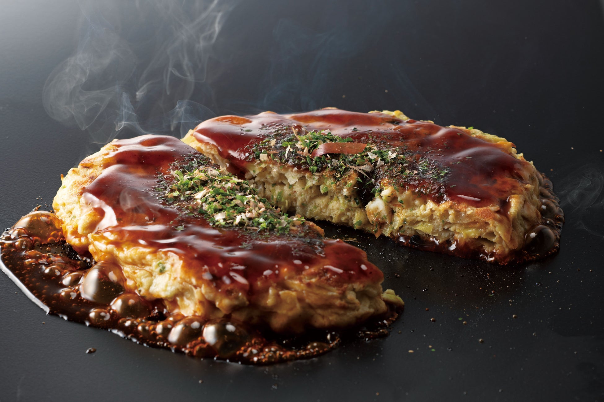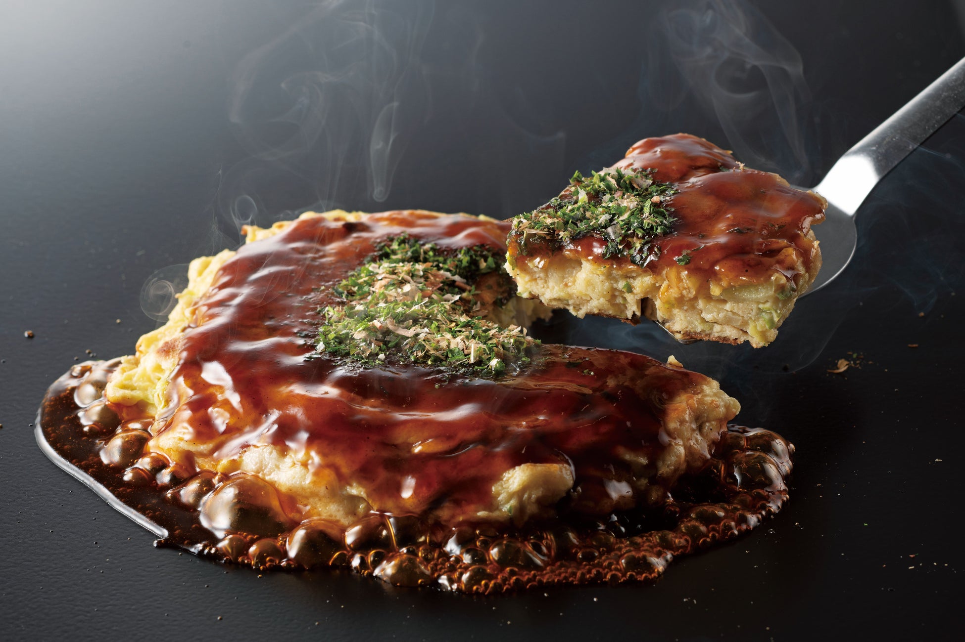 関西のだしが入ったふっくら生地に、ざく切りキャベツがたくさん。コクのあるナツメヤシの実「デーツ」を使った甘いソースがよく合います。