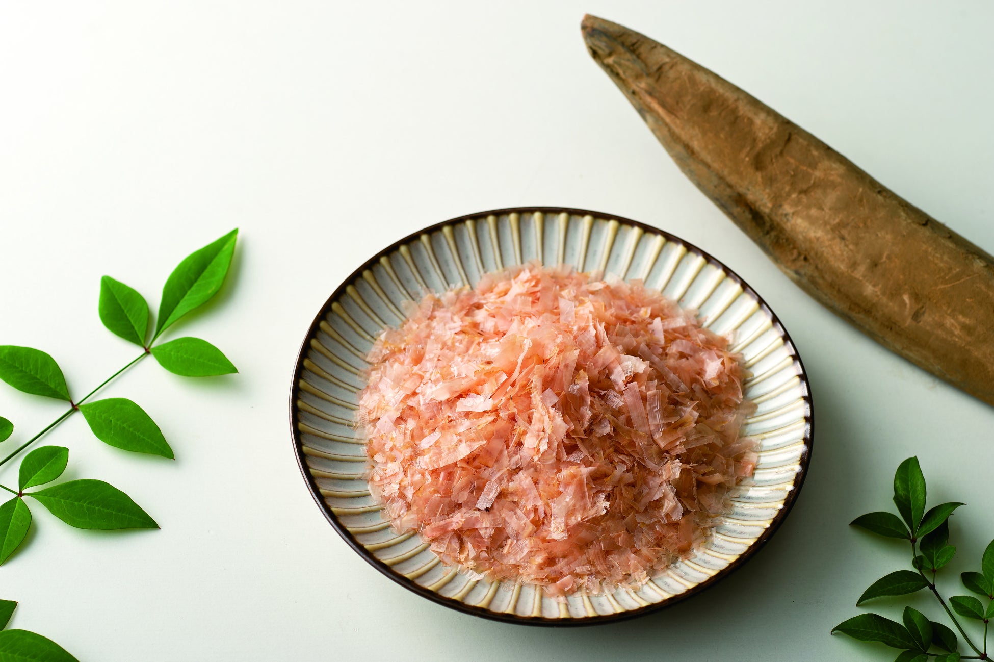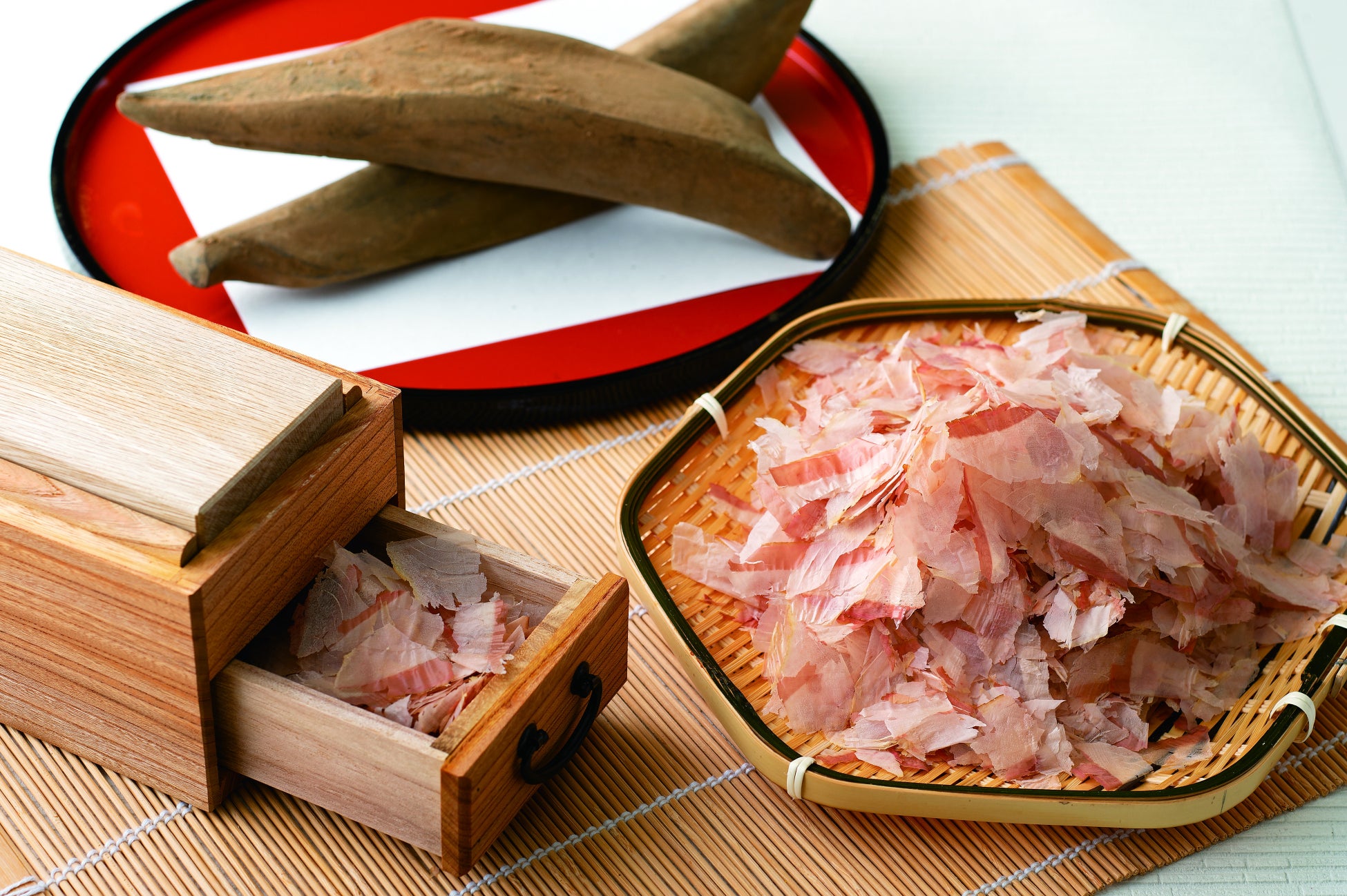 1本釣りかつおを使用。血合いを残して加工、鹿児島・枕崎伝統の技で熟成した本枯節は、コクがありながら、すっきりした味わい。