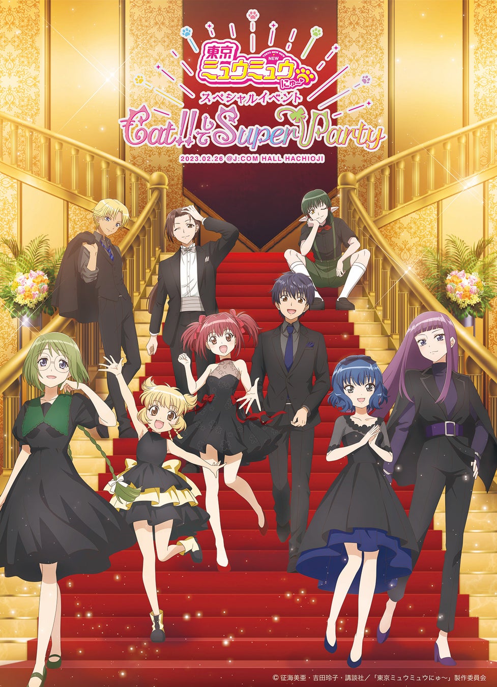 正装したメインキャラクターが勢揃いし、パーティーへのワクワク感が高まるスペシャルなイラストとなっている。本イベントには、ミュウミュウ5人を演じるSmewthieに加え、内田雄馬、中村悠一、白井悠介、石原夏織、岡本信彦、山下大輝、梅原裕一郎と豪華キャストが出演。書きおろしの朗読劇やトーク、第2期のOP&EDミニライブ等をお楽しみいただける。