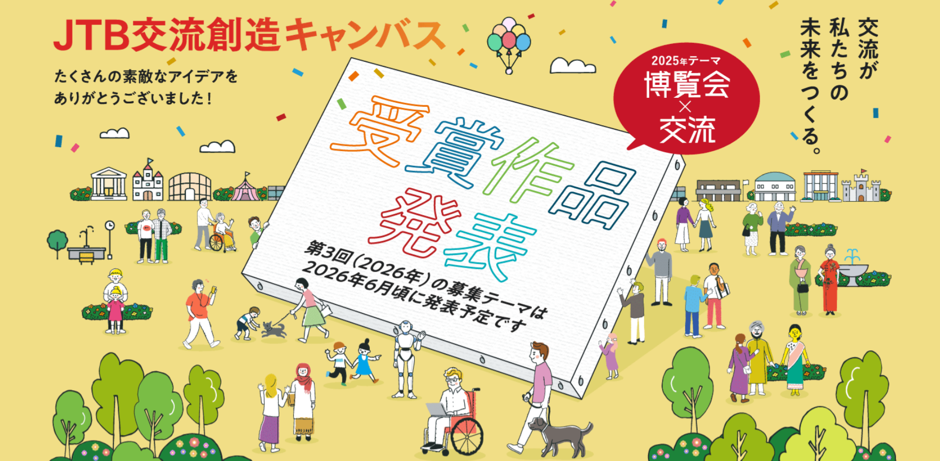 株式会社JTBは、未来の交流をともに描く取り組み「JTB交流創造キャンバス」の第2回開催にあたり、「博覧会×交流」をテーマとしたアイデアを募集しました。全国から337件もの多彩な提案が寄せられ、種や時空を超えた発想や宇宙・地球規模の壮大なアイデアなど、想像力に富んだ作品が多数見られました。これらの作品に共通していたのは、「真の交流は、互いの違いを認め合うことから始まる」という深い洞察です。