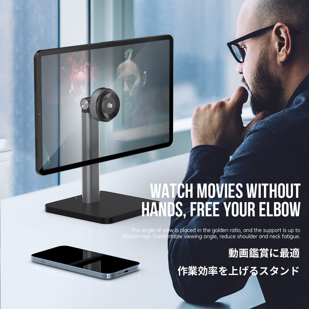 鑑賞時や作業中に手でデバイスを支えたり、スマホの角度に合わせて作業する必要はありません。