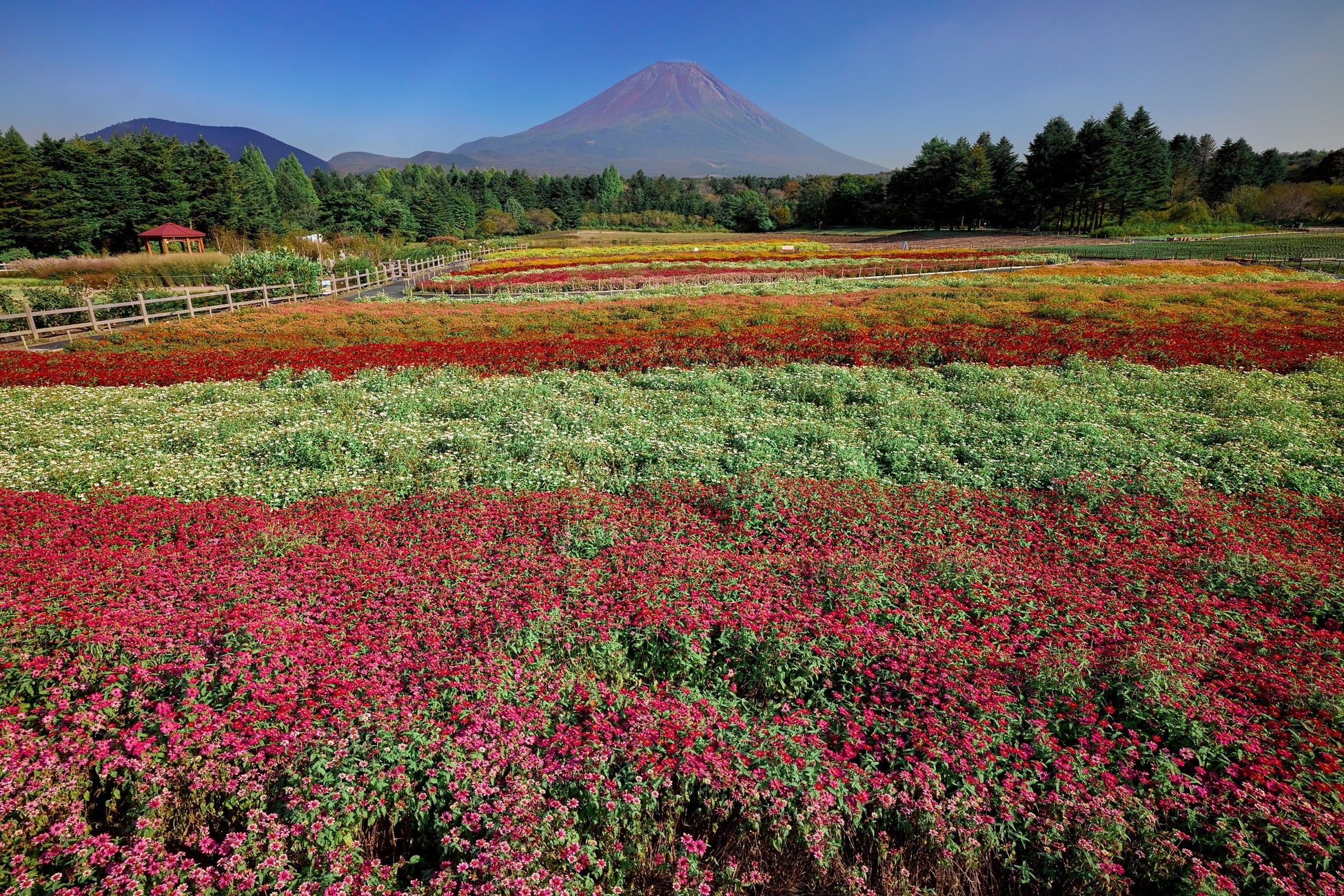 「虹の花まつり」は、富士山の春の風物詩「富士芝桜まつり」でお馴染みの富士本栖湖リゾートで、2022年から開催されているフラワーイベントで、雪をまとわない夏富士と色彩豊かな花々の競演が最大の見どころです。