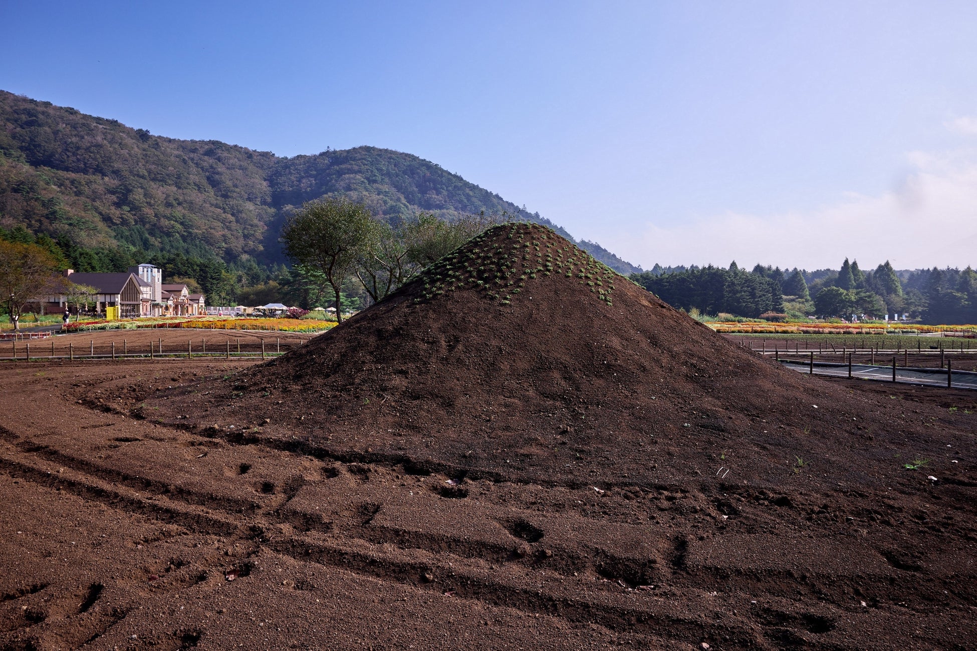 「富士芝桜まつり」は残雪の美しい世界遺産・富士山と、一面を埋め尽くす色鮮やかな芝桜との共演が楽しめる春の風物詩で、毎年4月中旬~5月末にかけて開催する、関東最大級となる50万株の芝桜の祭典です。残暑が残るこの時期から、早くも来春に向けて、芝桜の株植えを開始しました。虹の花まつり開催期間中に、スタッフが毎日株植えをおこなっています。