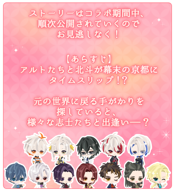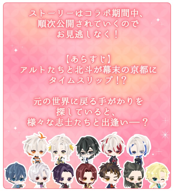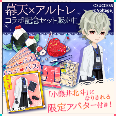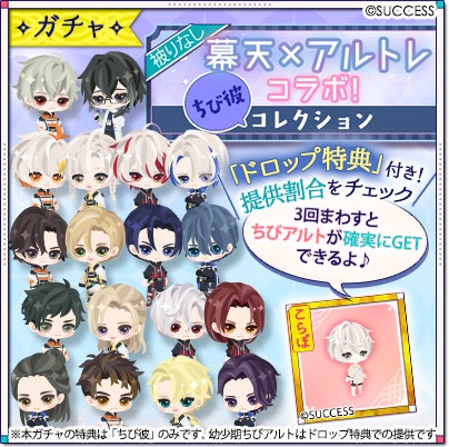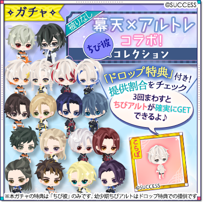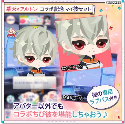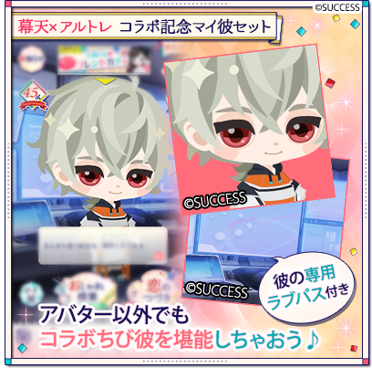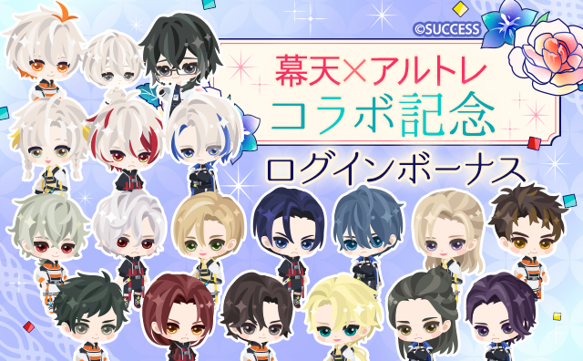 コラボストーリーを順次配信するほか、アルトたちの衣装を着用した、「幕天」に登場する彼たちのちび彼アバターや、アルトたちの幕天風ちび彼アバターが手に入るコラボガチャなど、様々な企画を開始しておりますので、この機会にぜひ「アルトレ」と「幕天」の特別なコラボレーションをお楽しみください。