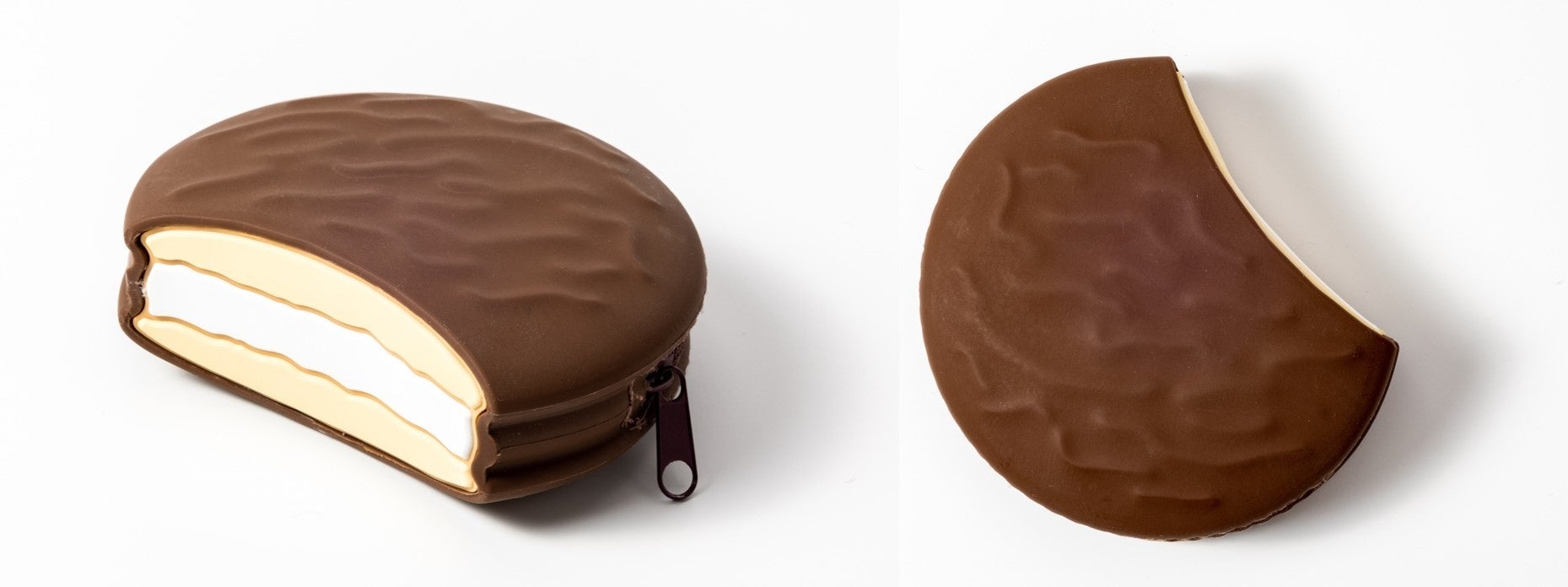 - チョコパイ型ポーチはひと口かじったようなかわいいデザイン。やわらかいシリコン製