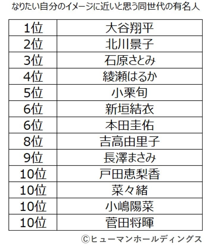 なりたい自分のイメージに近いと思う同世代の有名人について質問したところ、男女総合1位「大谷翔平選手」、2位「北川景子さん」、3位「石原さとみさん」という結果になりました。