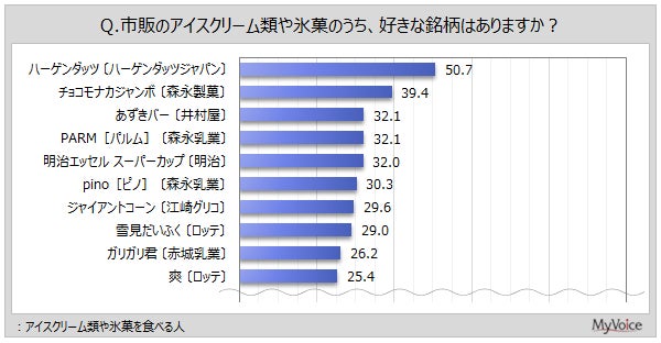 アイスクリーム類を食べる人が好きな銘柄は(複数回答)、「ハーゲンダッツ」が50.7%で1位、次いで「チョコモナカジャンボ」が39.4%、「あずきバー」「PARM」「明治エッセル スーパーカップ」が各3割強で続きます。