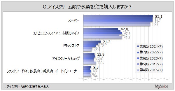 アイスクリーム類を食べる人の購入場所は(複数回答)、「スーパー」が85.1%、「コンビニエンスストア:市販のアイス」が42.8%です。