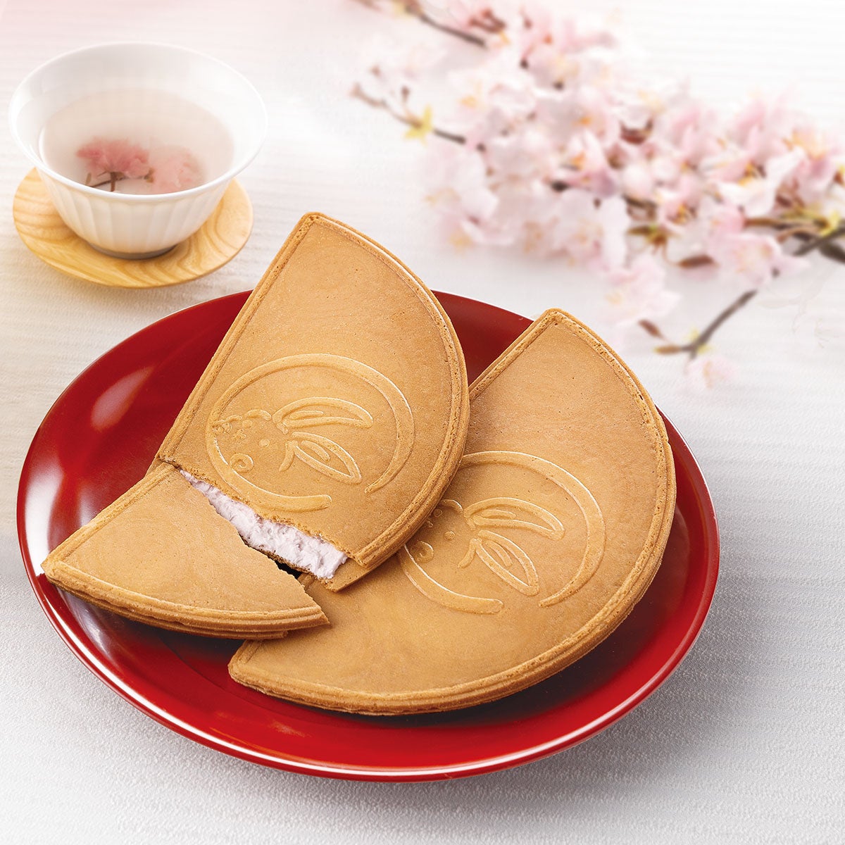 『鎌倉さくら茶半月』は、上品に香るさくら茶のクリームをふんわりとはさみこんだ、満開の桜の優雅な香りが広がる春限定品。ほのかに甘いゴーフレットから、さくら茶のさわやかな味わいがお口の中に広がります。