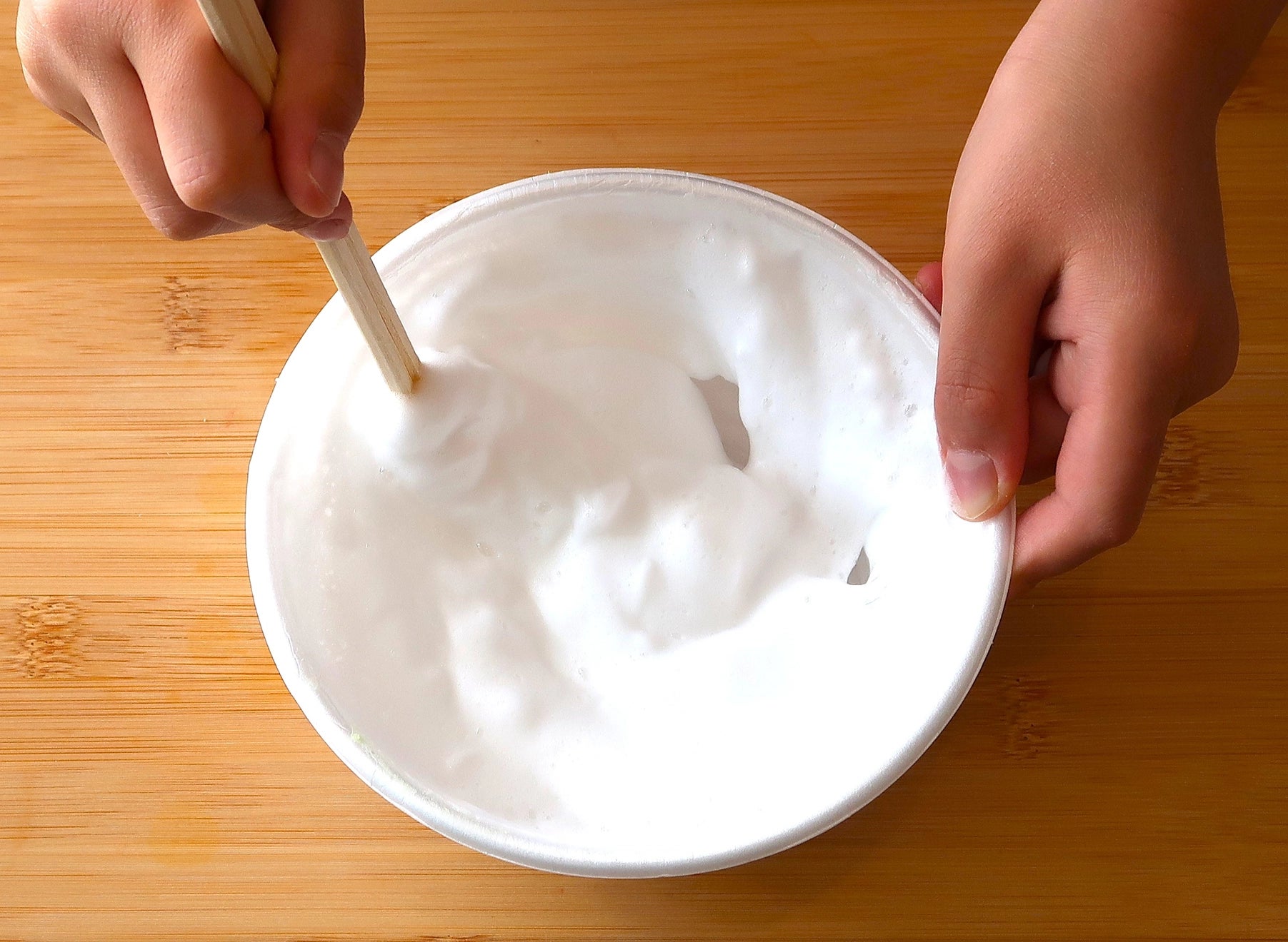 スライムは、「洗濯のり」と「ホウ砂」と「水」の化学反応で作られます。身近な材料だけで作ることができますが、今回のはるいろスライムは、ある「ひみつの材料」を混ぜて作ります。一般的なスライムとはちがう「ふわふわの感触」を、ぜひ教室で体験してみてください。