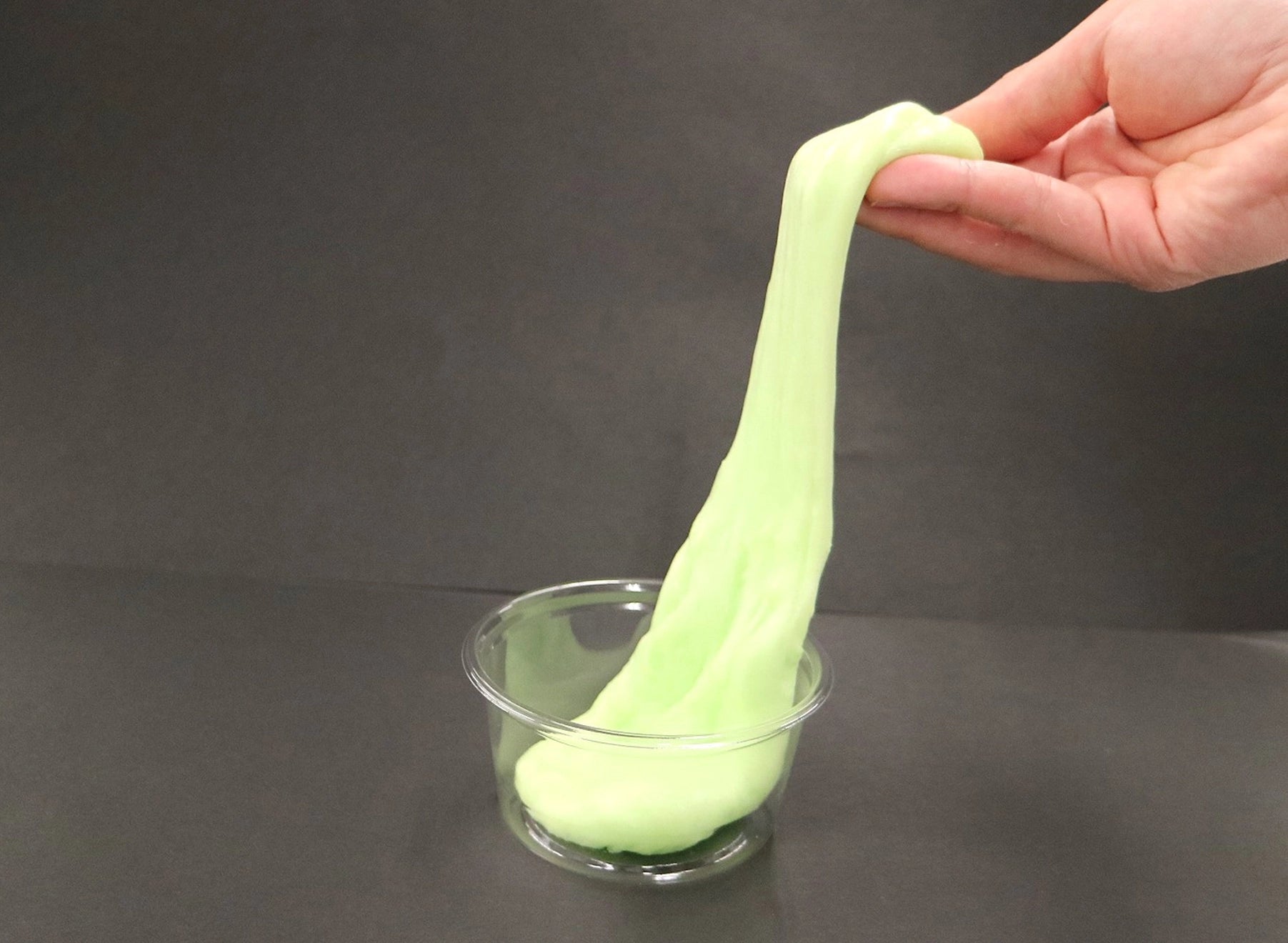 スライムは、のびたり形が変わったりしますが、いったい「何という状態のもの」でしょうか。身のまわりのものは、どのような姿をしているかによって「固体・液体・気体」の大きく3つのグループに分けられます。スライムはどれにあてはまるのか、実際に作って確かめてみましょう。