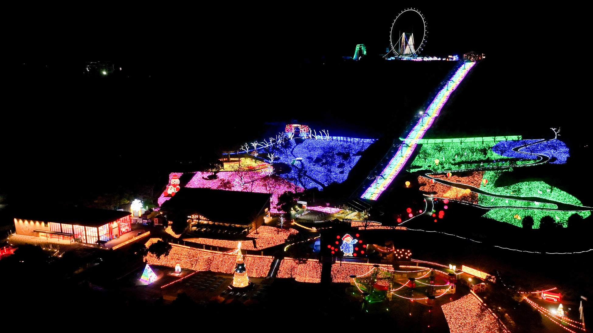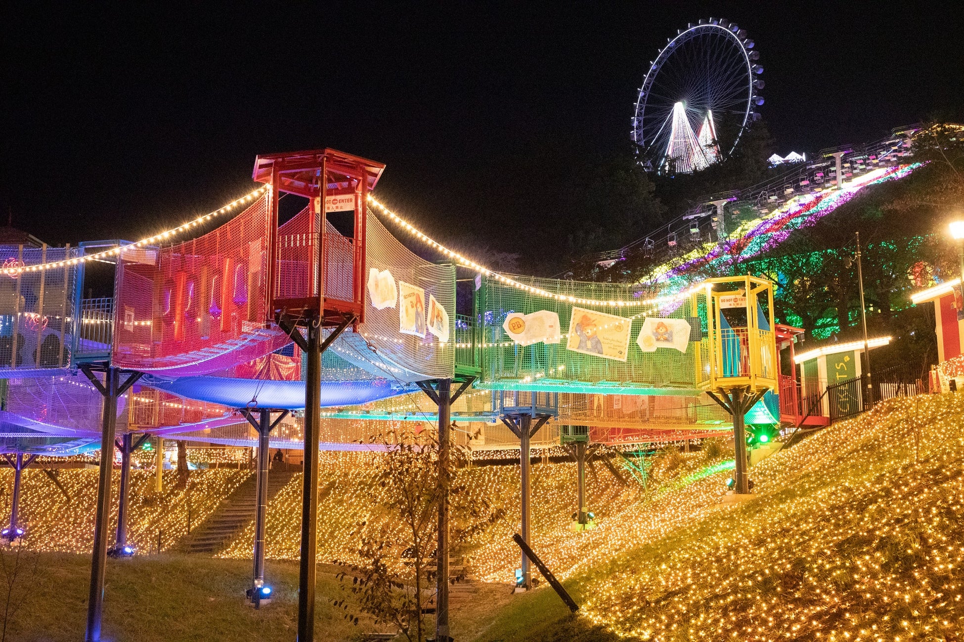 空中ネットアスレチック「ハッスルスパイダー」がカラフルにライトアップされ、「光の空中アスレチック」となるほか、全10種類のナイトアトラクションが登場します。全長250mのリフトに乗ってイルミネーション上空を空中散歩する「虹のリフト」や、標高370mに立つ「光のかんらんしゃ」など、起伏に富んだアウトドアリゾートならではの「空から眺めるイルミネーション」が充実しています。