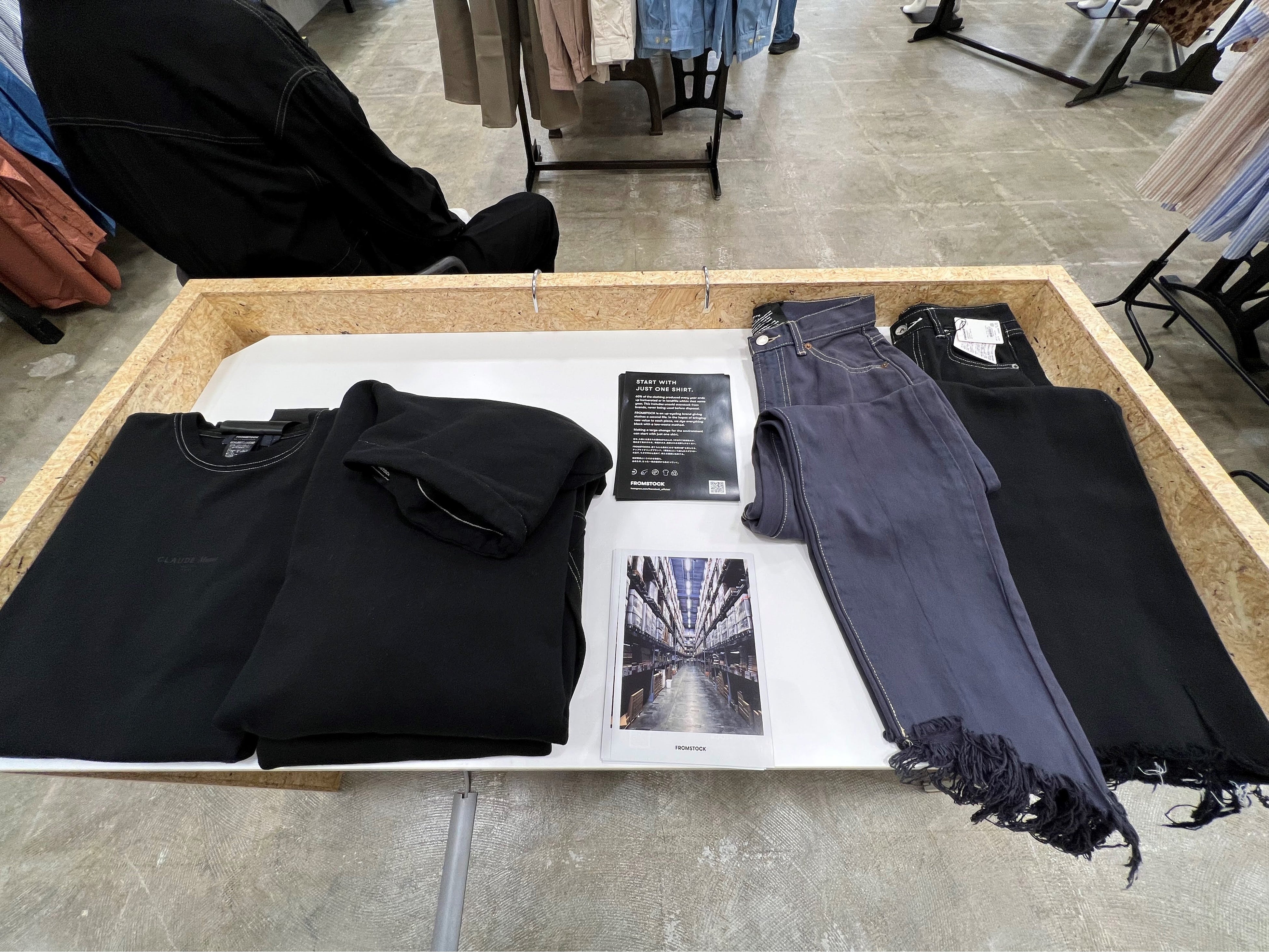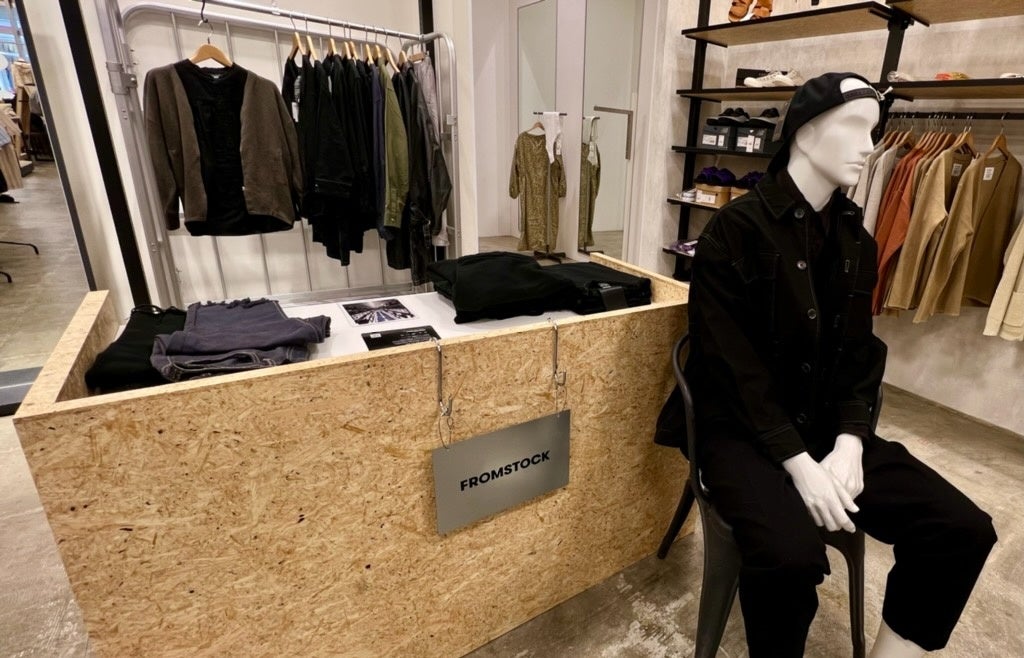「FROM STOCK」は倉庫に眠る残在庫を黒染めによって蘇らせ、一品一品の仕上がりが異なる商品を販売する循環型ファッションブランドです。これまでECでの販売や期間限定ストアでのみで展開していたブランドが店舗内に常設されることで、独自の風合いを実際に手にとって感じていただけるようになりました。「FROM STOCK」は全て1点ものの商品のため、ご来店のたびに偶然の出会いをお楽しみいただいております。