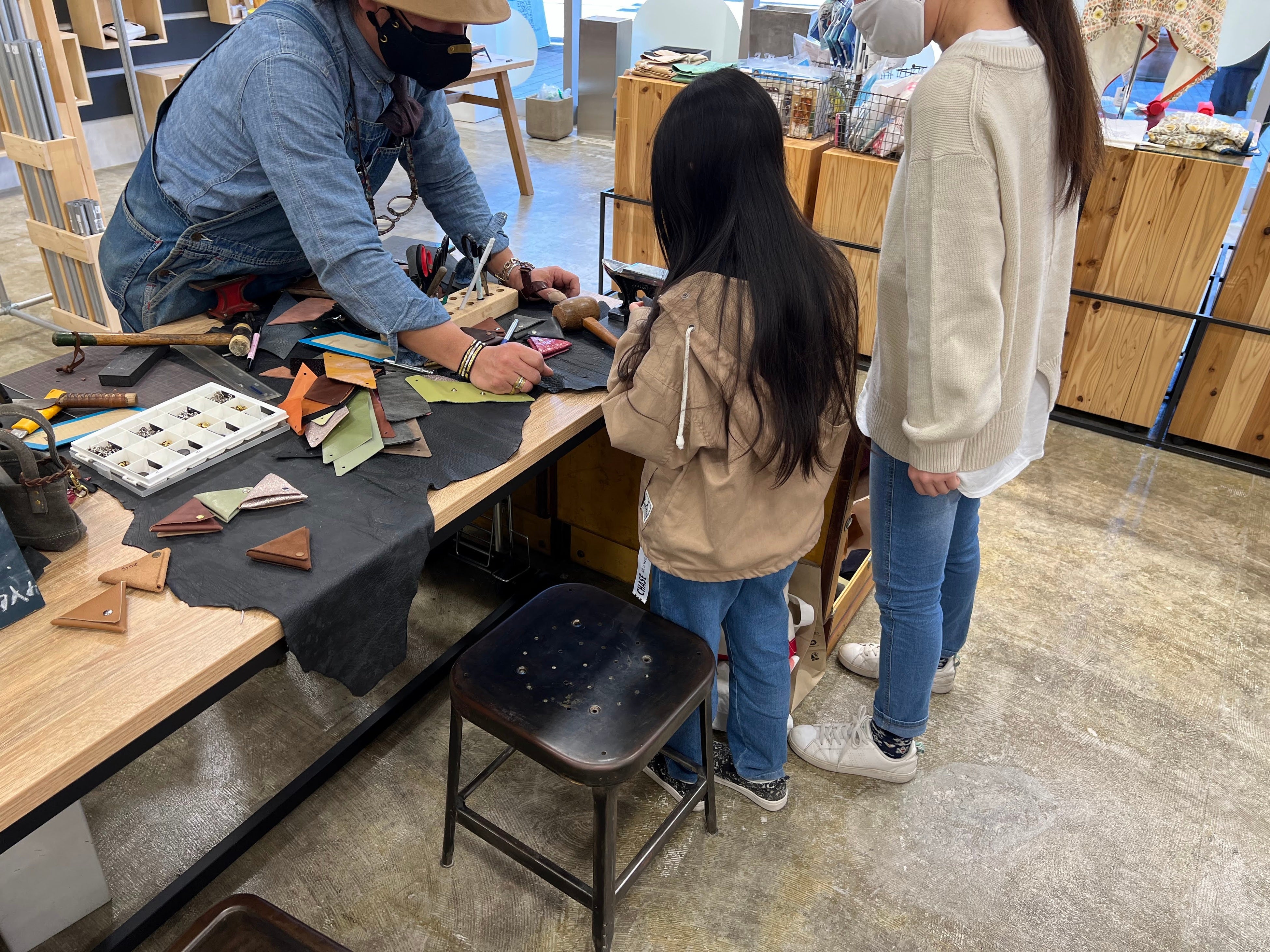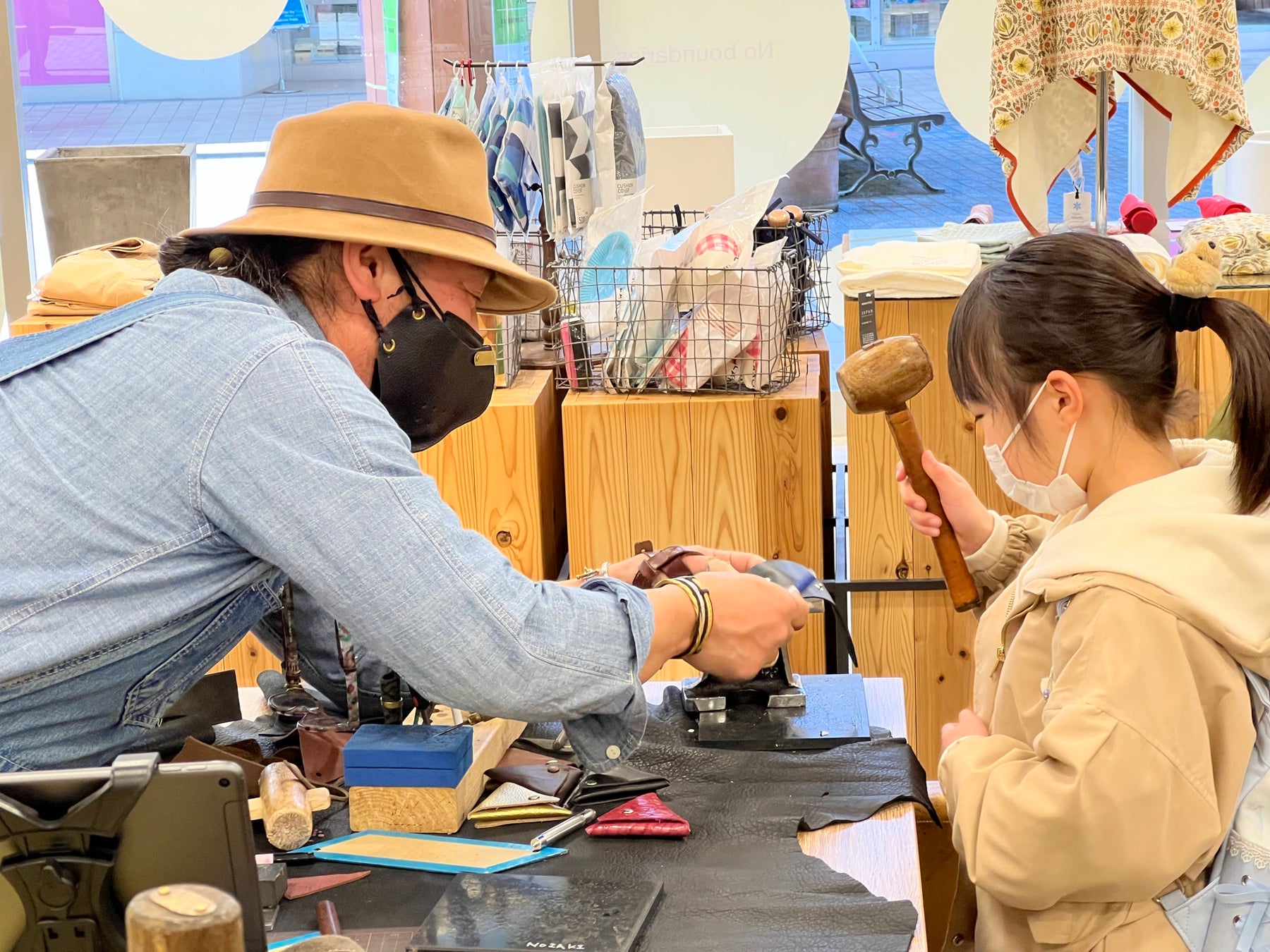 OFF STOREの特徴の一つであるファッションのアップサイクルを体験いただけるワークショップでは、初日から待ち時間をいただくほど多くのお客さまにご参加いただきました。オープンイベントでは、廃棄されてしまう革の端切れを使ったワークショップを開催し、お客さまがご自身の手でアップサイクルした世界に一つのオリジナル小物入れをお持ち帰りいただきました。