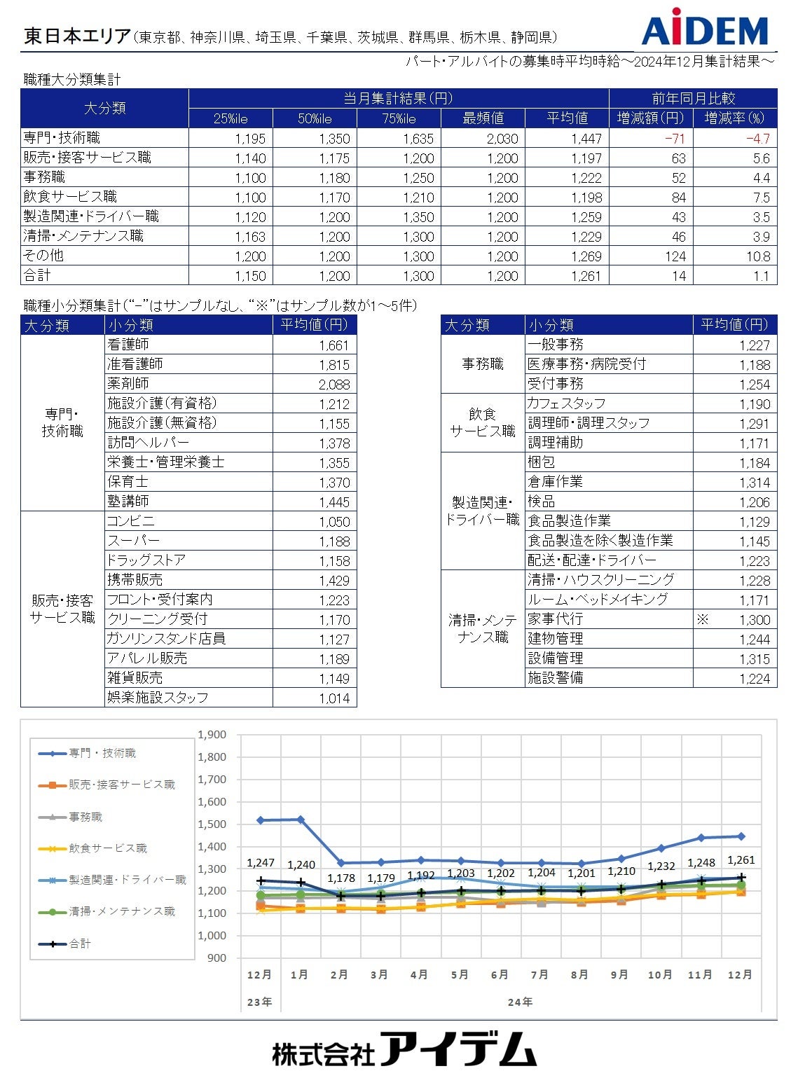 総合人材情報サービスの株式会社アイデム(本社:東京都新宿区 代表取締役社長:椛山 亮)は、求人メディア『イーアイデム』や採用ホームページ構築サービス『Jobギア採促』を利用して公表された求人情報から、2024年12月のパート・アルバイト募集時平均時給を集計いたしました。