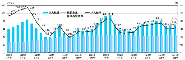 来春2023年3月卒業予定の大学生・大学院生対象の大卒求人倍率は1.58倍と、2022年卒の1.50倍より0.08ポイント上昇した。2021年卒は新型コロナウイルスの感染拡大による景況感の悪化により、倍率は10年ぶりに0.3ポイント以上低下した。2022年卒も、コロナ禍の影響を受けわずかに低下したものの、1.5倍台を維持し底堅い結果となった。今年(来春2023年卒)は0.08ポイントの上昇となり、回復傾向にある。