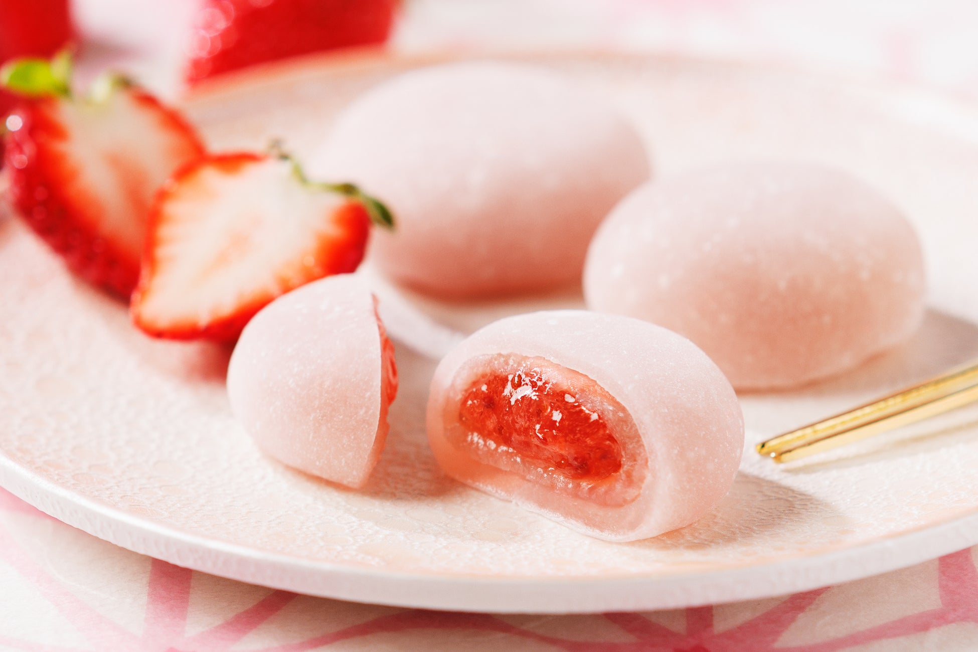 栃木県産とちあいかを使用した甘酸っぱいいちごソースを、生クリームを加えたまろやかな苺餡で包みました。ほんのりバニラの風味を感じるいちご色のお餅で仕上げました。