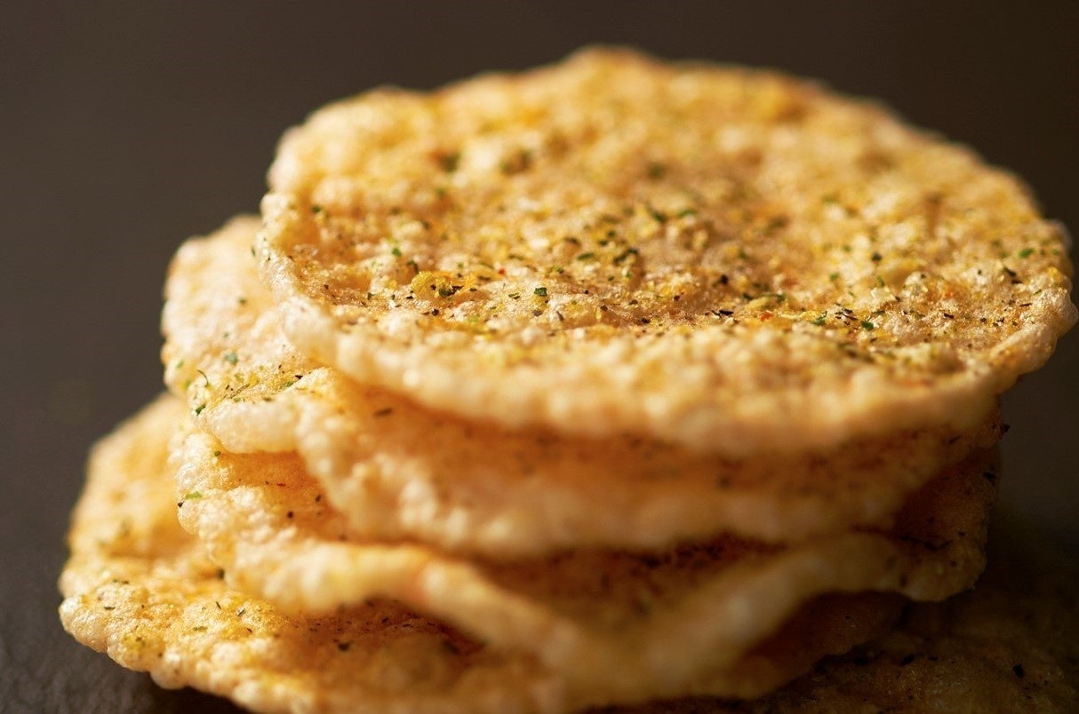甘みのある天然えびを生地に使用し、旨味を凝縮した雲丹のピューレとすじ青のりを練り込んださっくさくに揚げたせんべい。パウダー状にした雲丹をふりかけ、風味をぐっと引き立てた一品です。