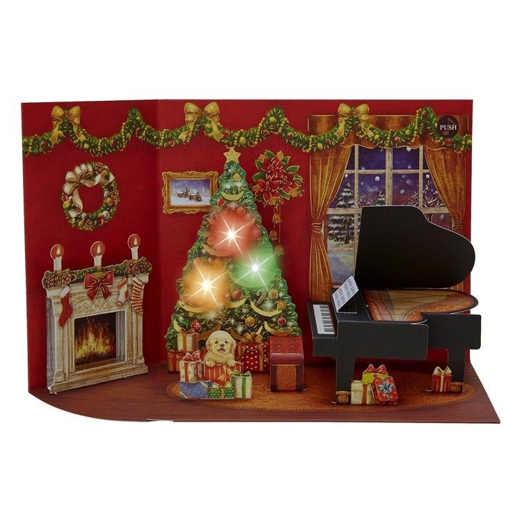 ドールハウスのような立体カードで、ボタンを押すとピアノが奏でるクリスマスメロディーが流れます。