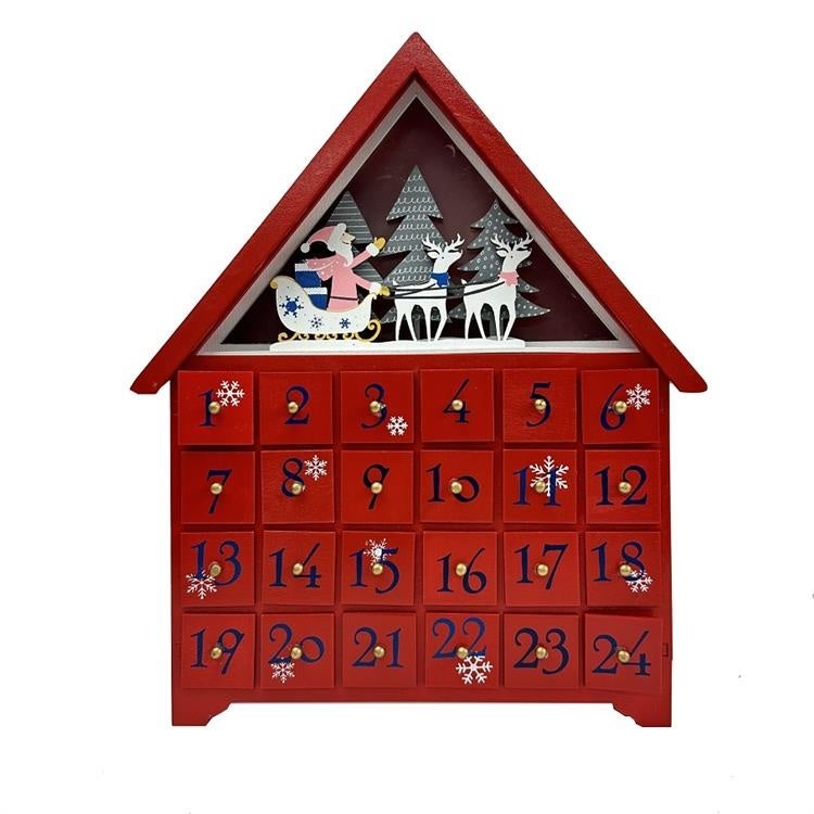 屋根裏の部分にLEDライトが付いた木製ハウス型カレンダー。24日分のひきだしの中には、