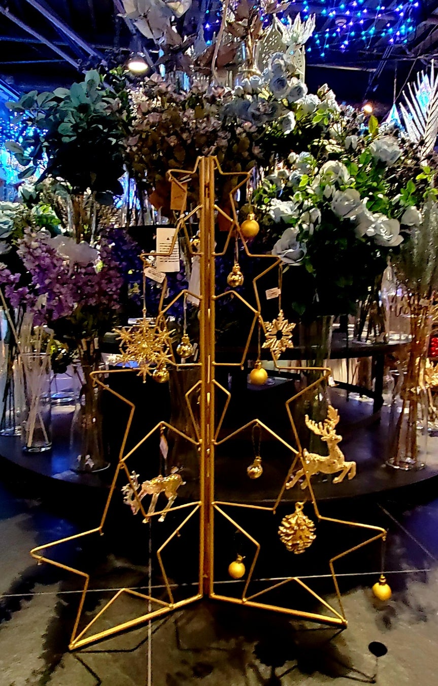 ゴールドのワイヤーを組み立てて仕上げる星のデザインツリー。オフシーズンには