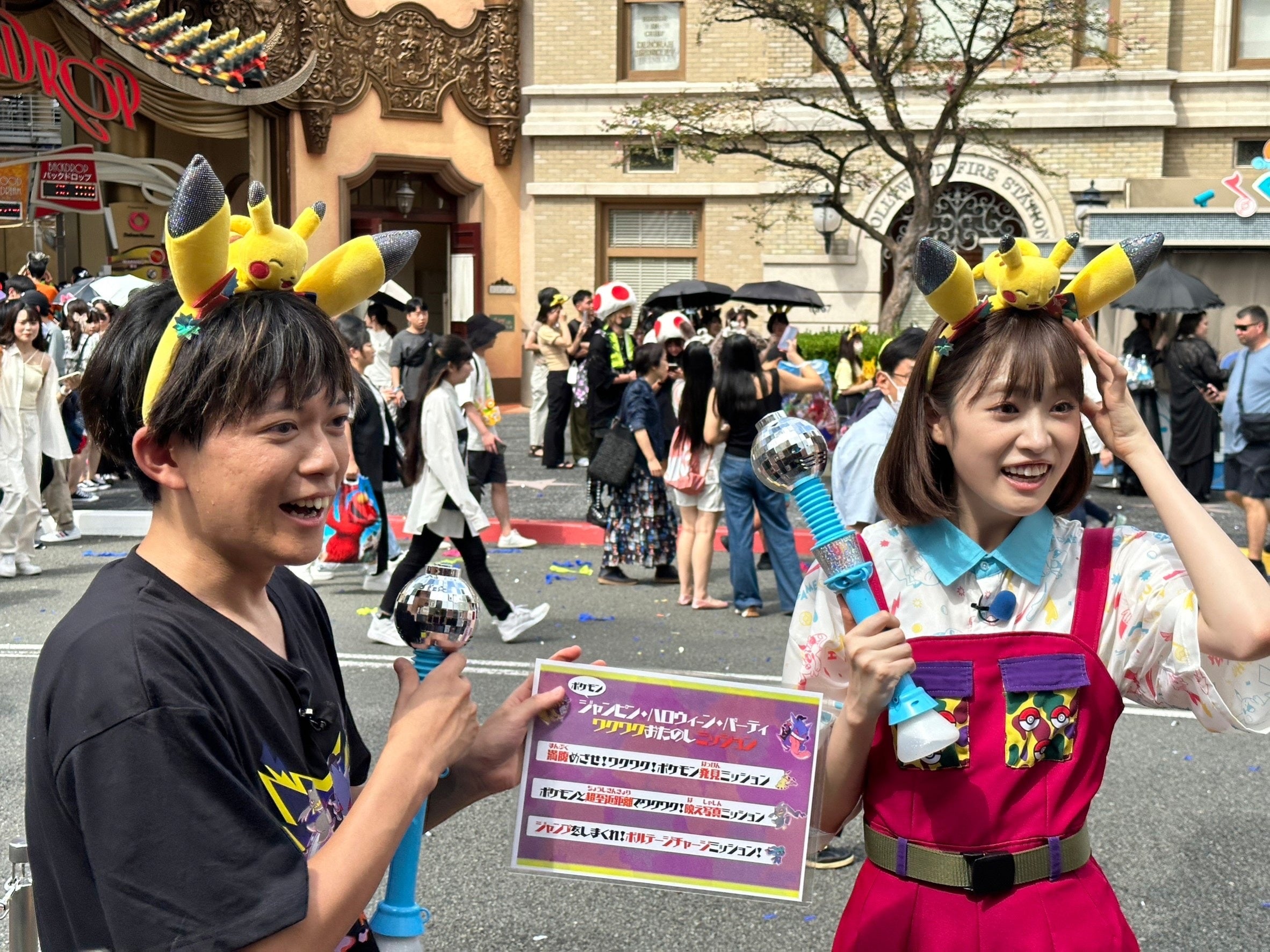 毎年人気を博しているUSJのハロウィーン・イベントですが、今回の撮影で二人が楽しみにしていたのは、ユニバーサル・スタジオ・ジャパン史上初となるポケモンたちによるハロウィーン・ショー。パークオリジナルコスチュームを身にまとった“DJピカチュウ”や、“DJゲンガー”、そして大暴れする「ムウマ」「ジュペッタ」「ミミッキュ」などのゴーストタイプのポケモンたちが登場するショーです。軽快なビートと派手な映像に合わせて、一緒に踊り、ジャンプしまくりました。