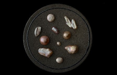 琵琶湖に棲息する池蝶貝(いけちょうがい)から長い期間をかけて生産される琵琶湖真珠は、海の真珠と異なり形や色が様々です。この真珠を陶器の里・信楽で作られた焼締めの陶板に飾っています。