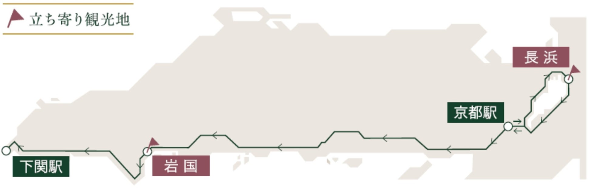 京都駅を出発して湖西線・北陸本線経由で琵琶湖を周遊しながら、1日目に木ノ本駅で下車し滋賀県長浜市を訪れます。その後、東海道・山陽本線経由で、せとうちエリアを巡り、2日目に岩国駅で下車し山口県岩国市を訪れた後下関駅に到着します。