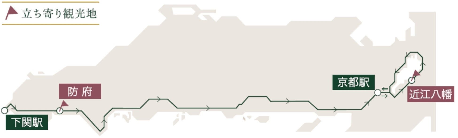 下関駅を出発して1日目に防府駅で下車し山口県防府市を訪れ、その後、山陽・東海道本線経由でせとうちエリアを巡り、2日目に近江八幡駅で下車し滋賀県近江八幡市を訪れます。その後、東海道本線・北陸本線・湖西線経由で琵琶湖を周遊しながら京都駅に到着します。