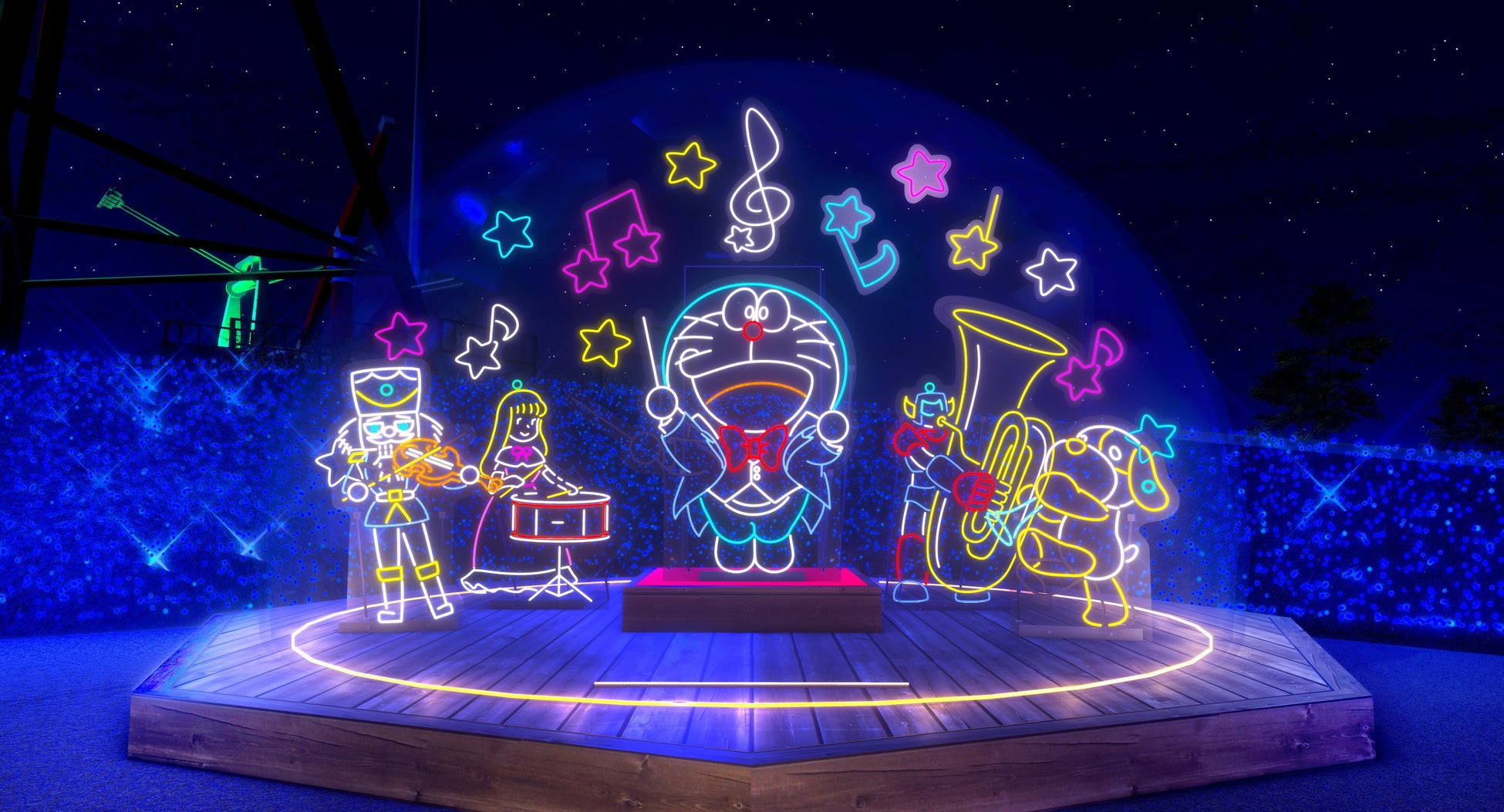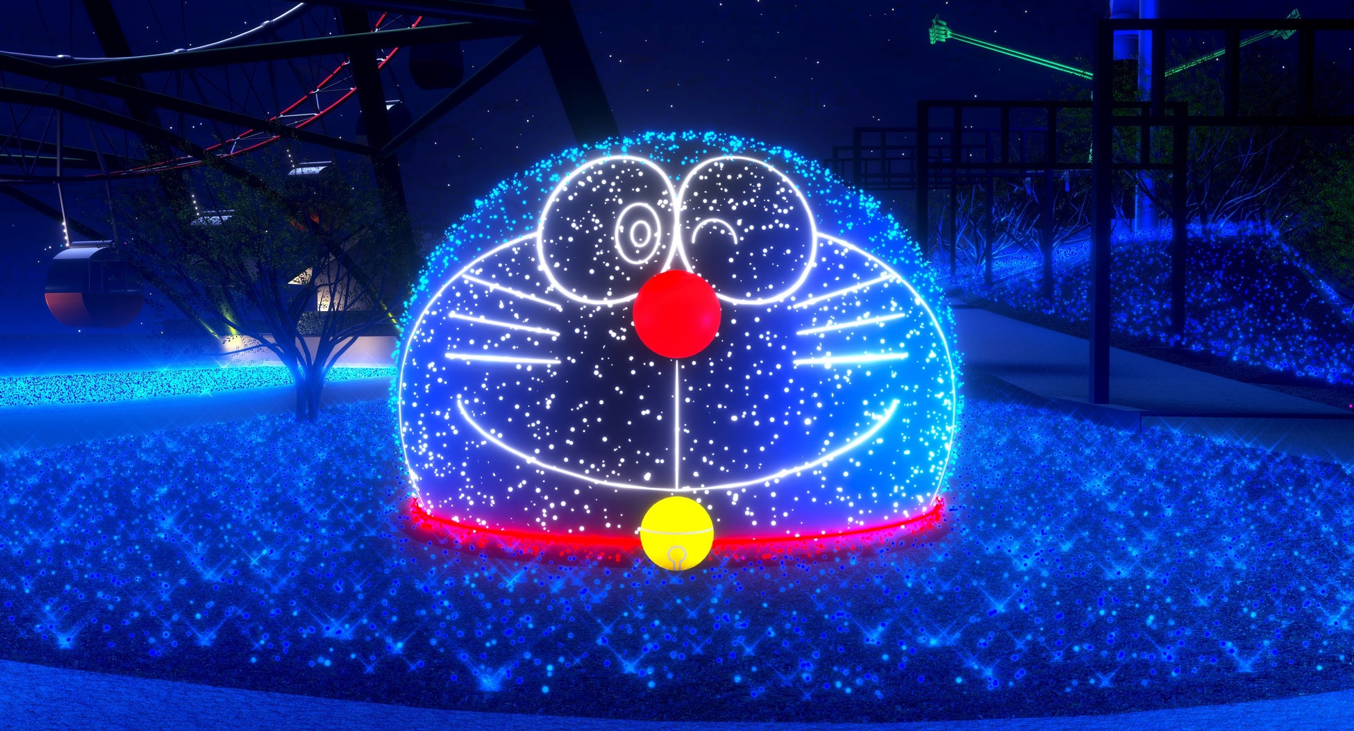ドラえもんや仲間たちがアイコニックなイルミネーションとして登場
