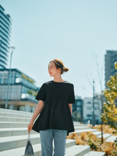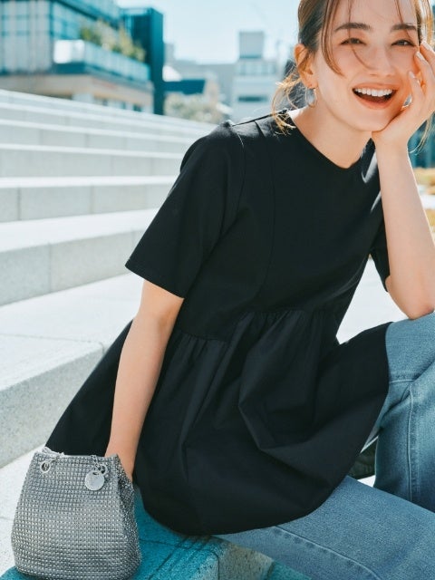 異素材&ペプラムデザインが技あり!甘黒コーデもTシャツでぐっと親近感