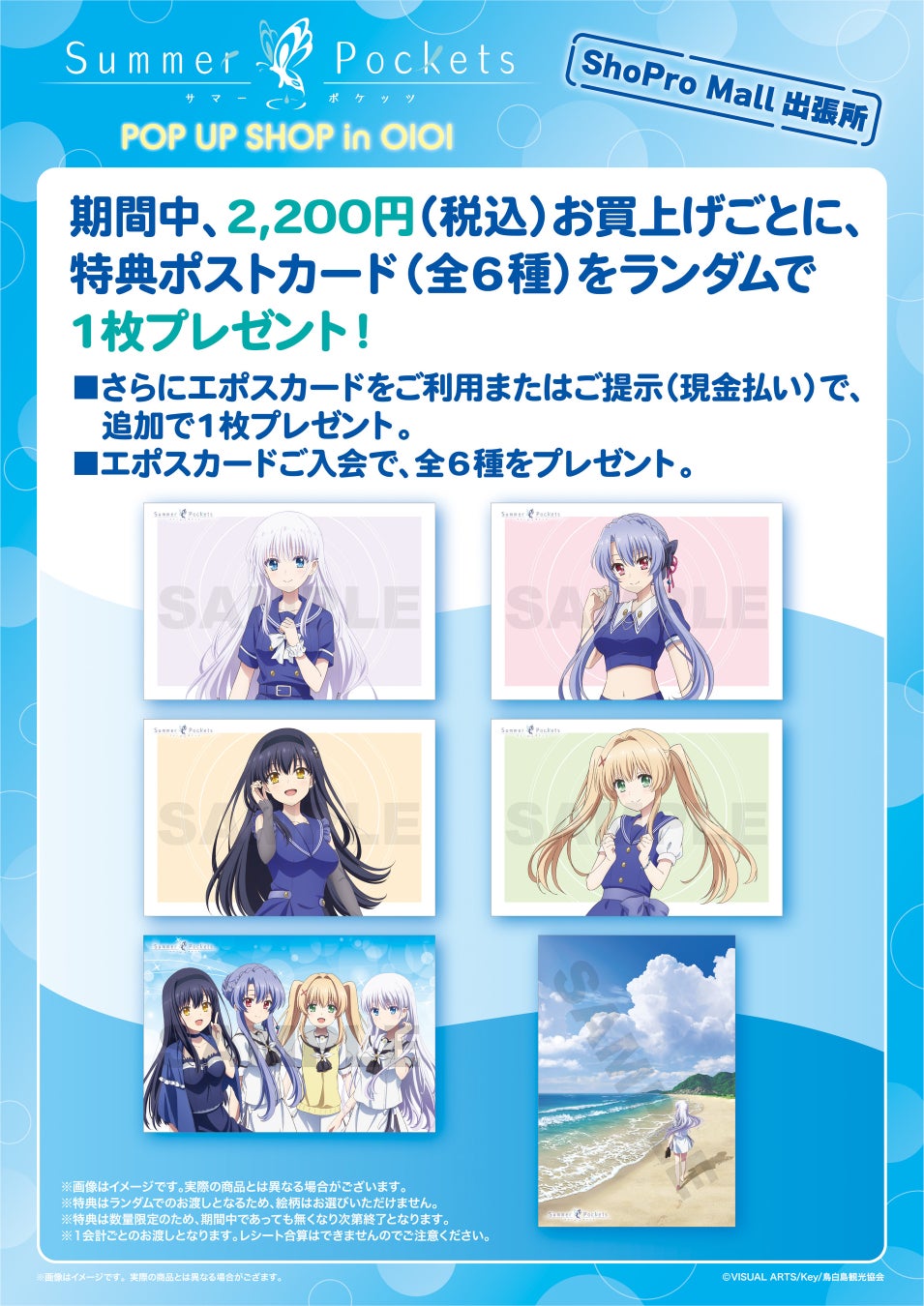 「Summer Pockets POP UP SHOP in OIOI」開催期間中、2,200円(税込)お買上げ毎に、特典ポストカード(全6種)をランダムで1枚プレゼントいたします。