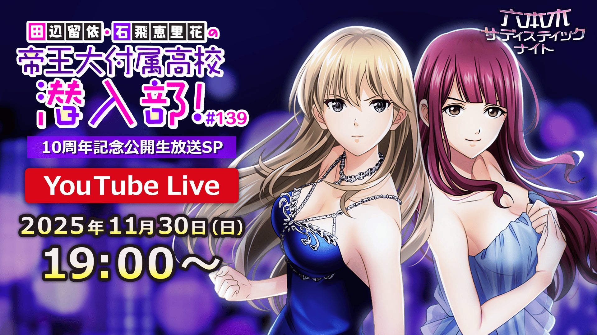11月30日(日)には公式YouTube番組の公開生放送&ミニライブの開催も予定しておりますので、この機会にぜひ「六本木サディスティックナイト」の10周年をお楽しみください。