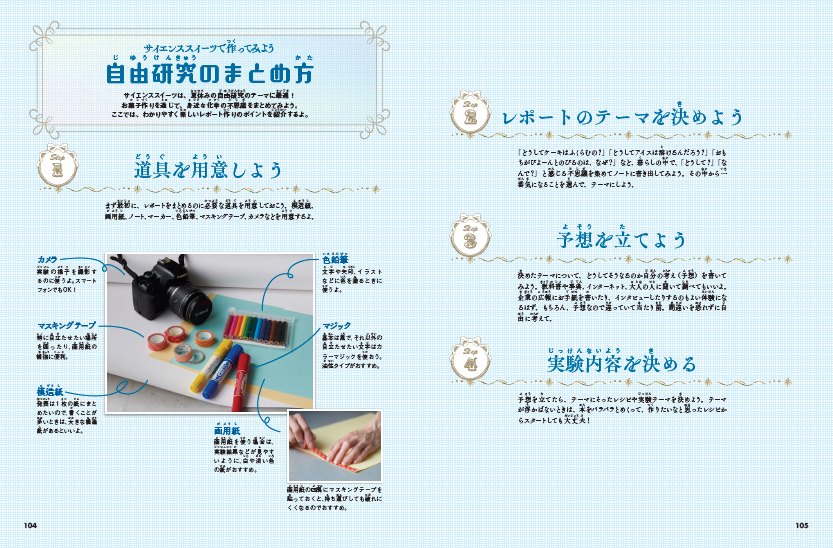 ドリンクレシピ」のカテゴリに分けてレシピを掲載しています。ケーキデザイナーである著者が考案しただけに、見た目も美しくSNSでも“映える”こと間違いなしの品々です。また、実験を成功させるポイントや、実験後のレポートのまとめ方なども掲載しているので、夏休みの自由研究にもぴったりです。