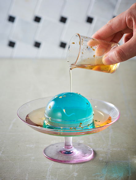 (材料)水、グラニュー糖、かき氷シロップ(ブルーハワイ)、アガー、梅シロップ(市販)、金箔