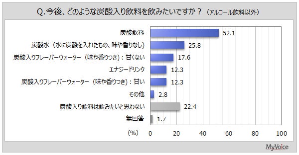 アルコール飲料以外で、今後飲みたい炭酸入り飲料の種類は(複数回答)、「炭酸飲料」が52.1%、「炭酸水」が25.8%、「炭酸入りフレーバーウォーター:甘くない」が17.6%です。