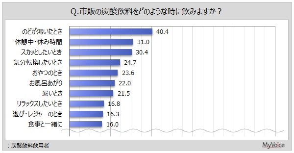 炭酸飲料飲用者に、どのような時に炭酸飲料を飲むかを聞いたところは(複数回答)、「のどが渇いたとき」が40.4%、「休憩中・休み時間」が31.0%、「スカッとしたいとき」が30.4%です。