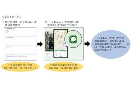 そこで、株式会社はんぽさきの地図アプリ「Liv Map」を導入し、要望の電子化と地図上での可視化を進めます。これにより、スマートフォンやPCから簡単に要望書の提出が可能となり、提出様式が統一されることでPTAの負担軽減と市職員の業務効率化、迅速な対応ができることが期待されます。