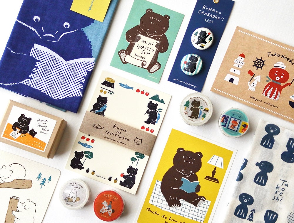 オリジナルイラストを使ったスタンプやマスキングテープ、一筆箋などの紙雑貨やトートバッグなどの布製品、木彫りや張子人形などのクラフト作品など多岐にわたる作品を展開しています。