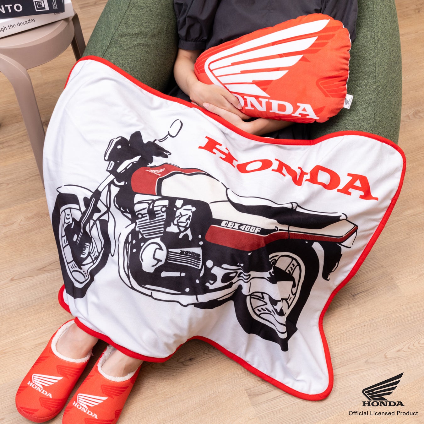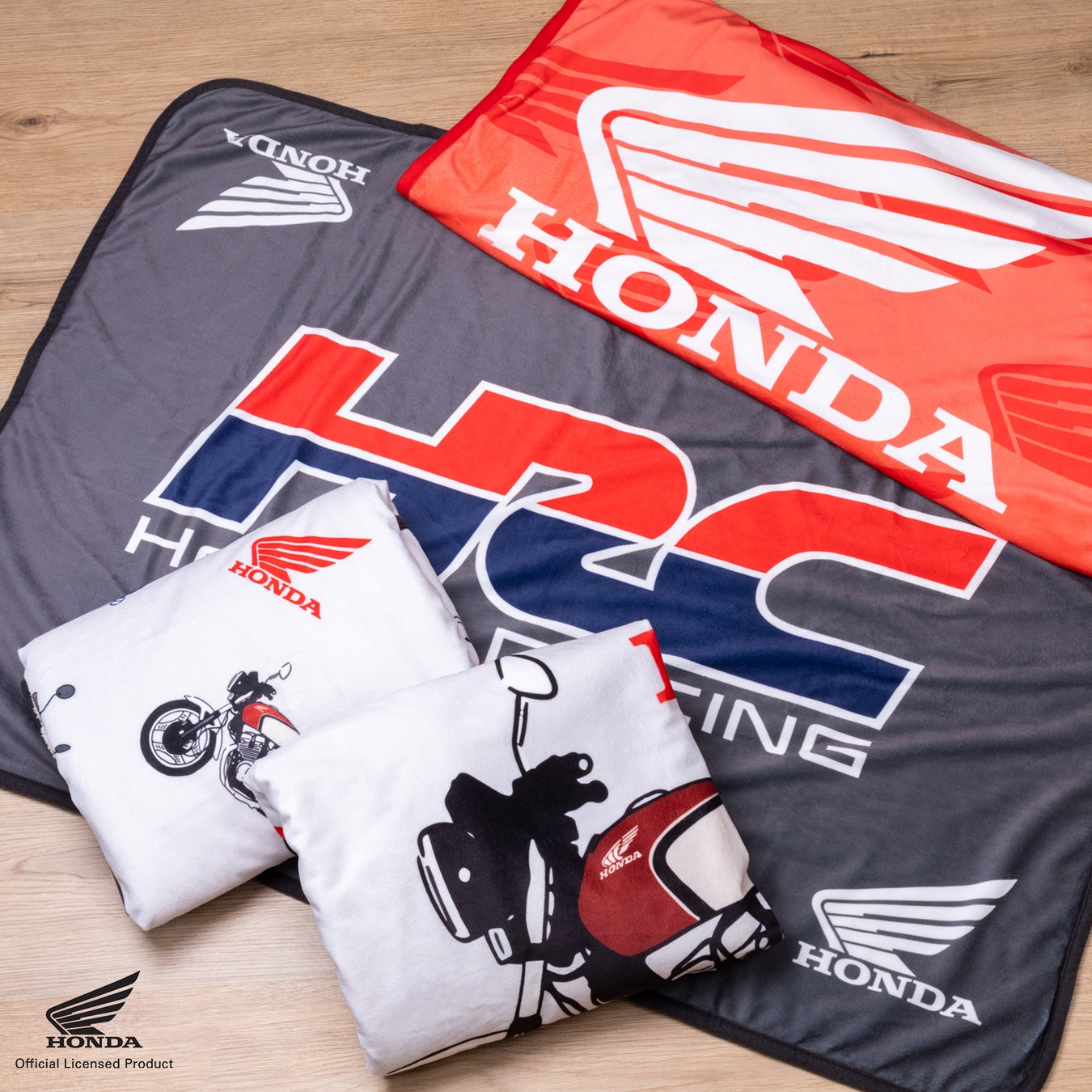滑らかな肌触りのフランネル生地に、もこもこのボア生地を合わせた2重構造のブランケット。総柄、WINGマーク、バイク、HRCの全4柄。