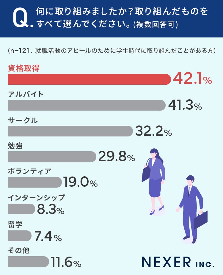 取り組んだこととしては「資格取得」や「アルバイト」が4割を超えていました。